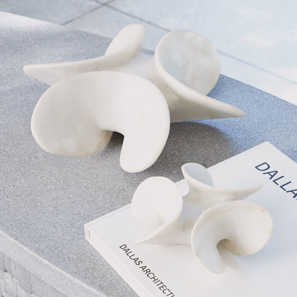 The Studio A Pankhudee paperweight or tabletop sculpture is a stylized, contemporary marble flowers could almost double as pinwheels. Hand carved from white ambaji marble by Indian artisans. Available in in paperweight (small) or tabletop sculpture (large).
