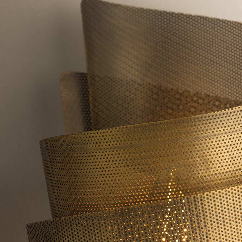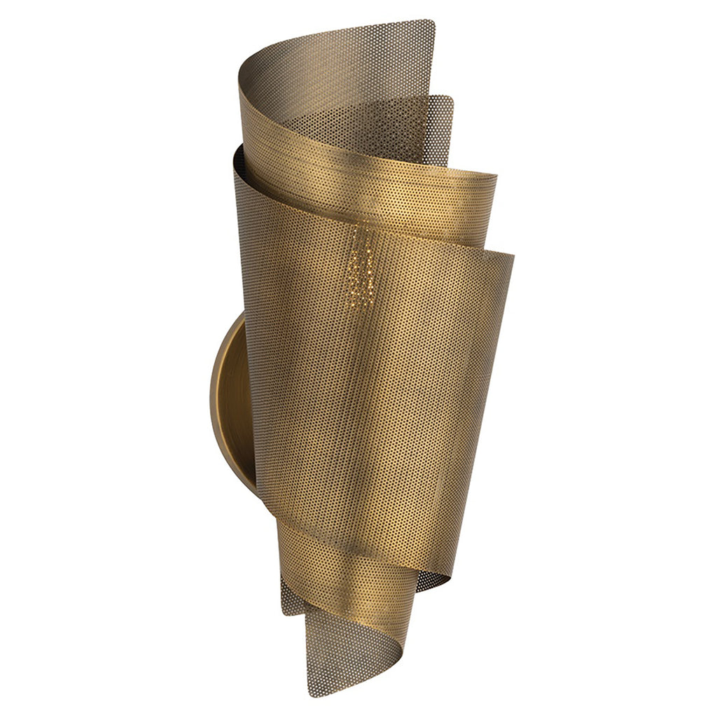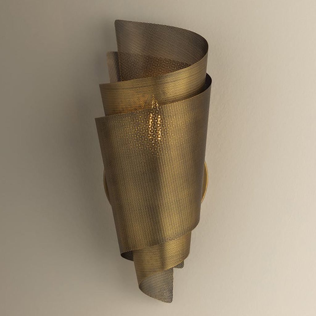 Reminiscent of a roll of wire mesh, the Troy Lighting Blaisdell sconce is equally organic and mechanical. Two sheets of fine metal are wrapped together to create a dynamic, cone-shaped silhouette. The fine all-over perforations add texture and allow light to escape from the shape. Finished in Patina Brass, Blaisdell makes an artful statement wherever it is placed.