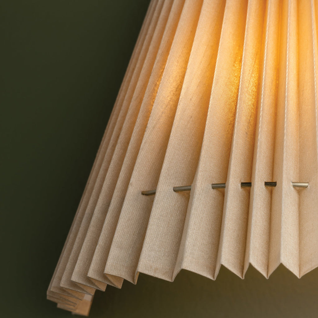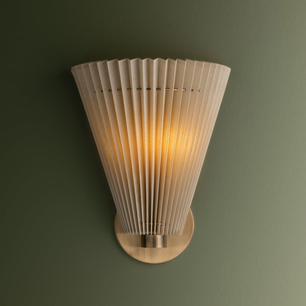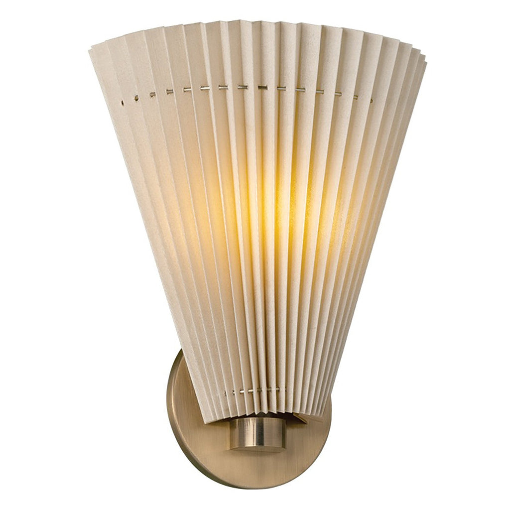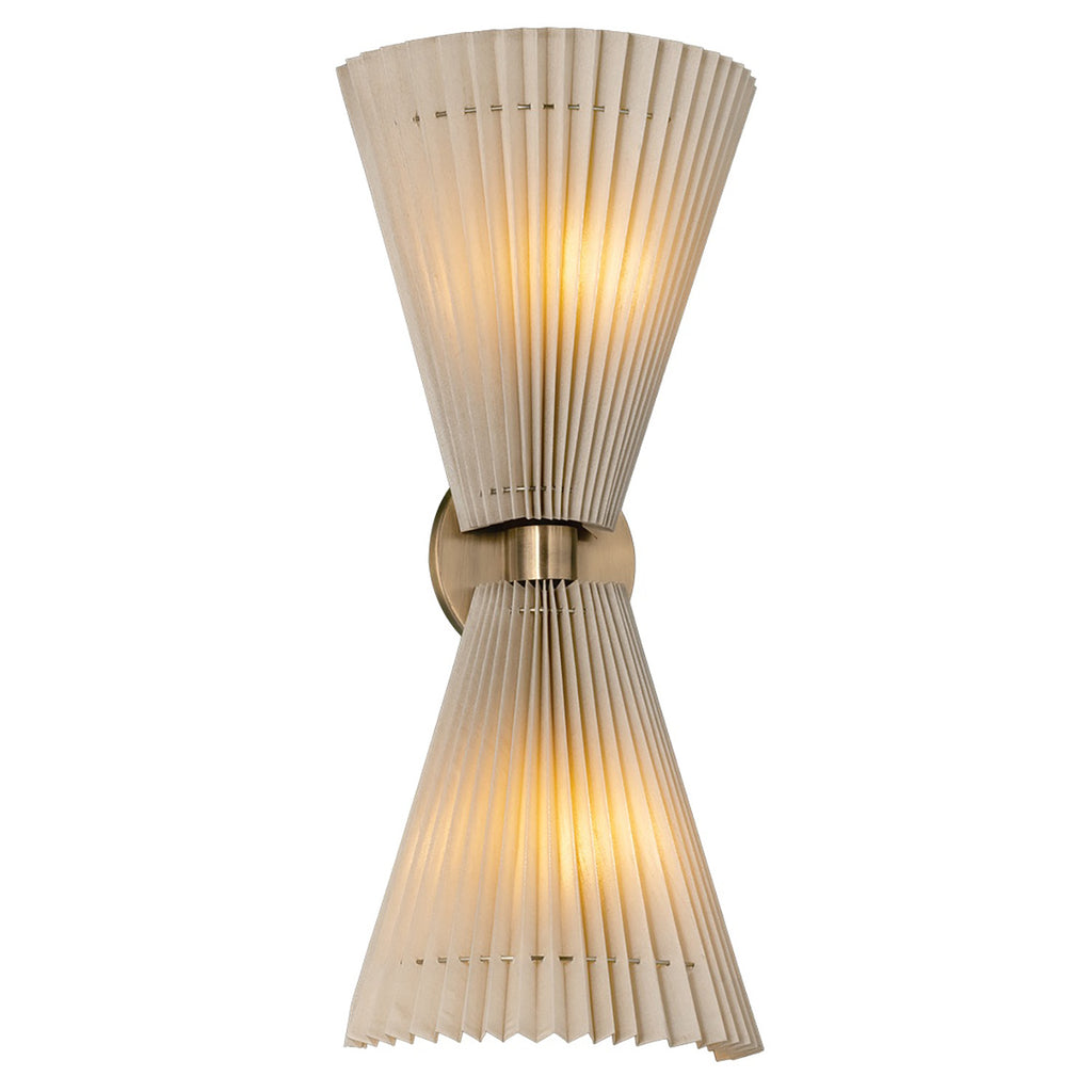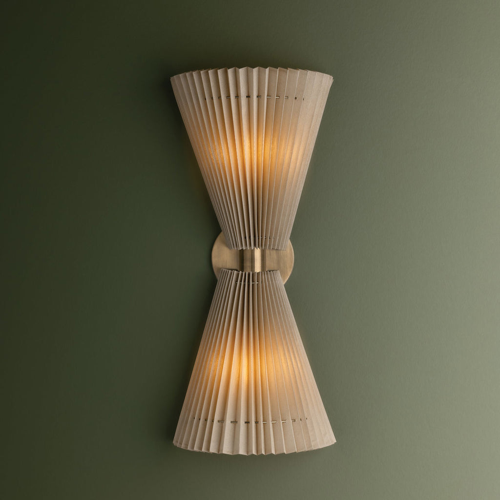 Simultaneously soft and architectural, the Troy Lighting Dell sconce pulls from vintage references of artful pleats and fan-like shapes. Available in a single or double light, the faux silk shades are gathered by thin metal rods that run through the shades, creating a natural, slightly irregular draping. The Patina-Brass finish of the hardware adds to the antique feel of this elegant wall light.