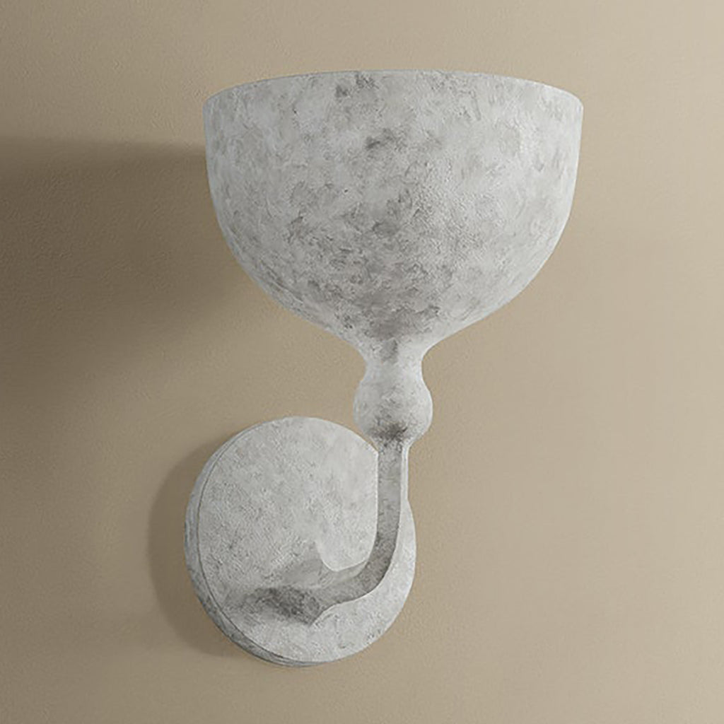 Inspired by the sculptural works of Stephen Antonson, the Troy Lighting Paget sconce features a chalice-shaped iron silhouette with a tactile Weathered White finish. A bead-like sphere below the shade adds a decorative accent that melds with the rest of the design elements. The plaster-like texture and soft shaping of Paget create a dramatic uplight that feels both ancient and modern.