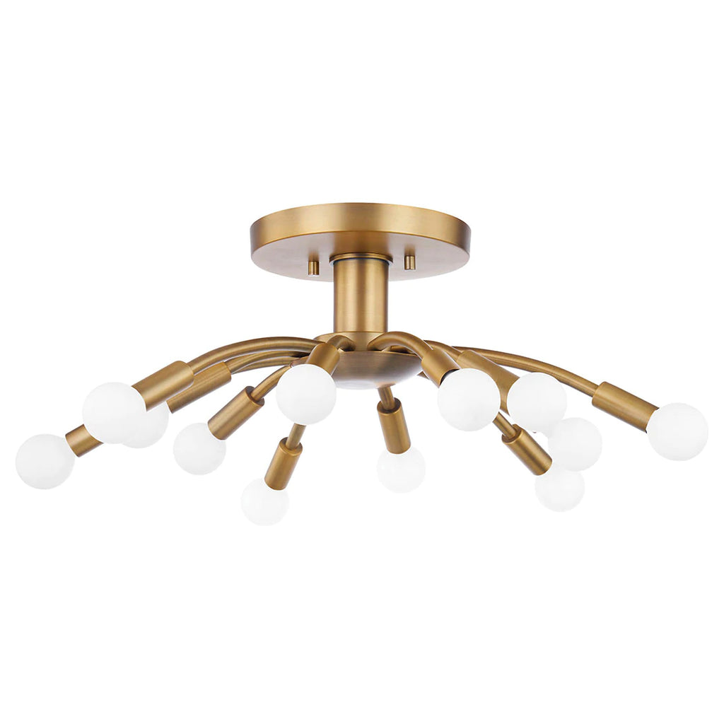 Casual, sophisticated, and little bit curious, express yourself with eclectic, artisan-made lighting by Troy. Seeking a statement light fixture? A ceiling light or flush mount by Troy illuminates your bedroom, living or dining room with chic design, sans harsh light. With twelve bulbs and over two feet in diameter, the Troy Tristan flush ceiling mount fills a room with both light and style. Sleek arms of varying lengths spill from the center of this sprawling fixture showering a space with light. Go for an aged look with the Patina Brass finish or keep things clean and sleek in Soft Black.