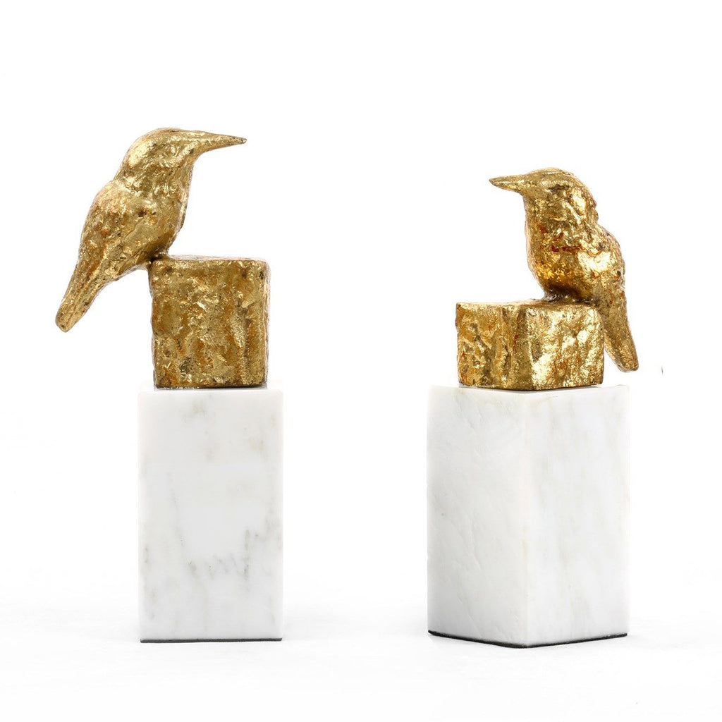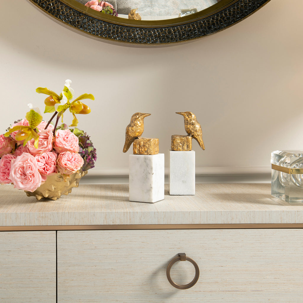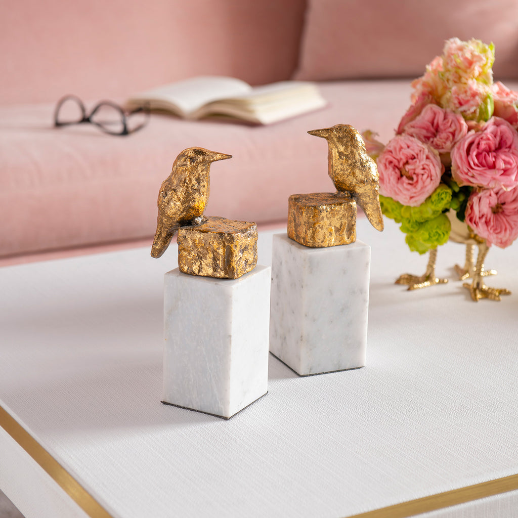 The V&H Finch statue is a pair of charming birds who sit in slightly different poses on contrasting blocks. Finches have social characteristics that are similar to those of people, because both like company. In the wild, Finches choose to live with others in small flocks. Here, our birds are covered with a glittering, textured impasto that suggests feathers and wings. Highlighting tactile qualities modernizes this recognizable subject with a fresh new energy.