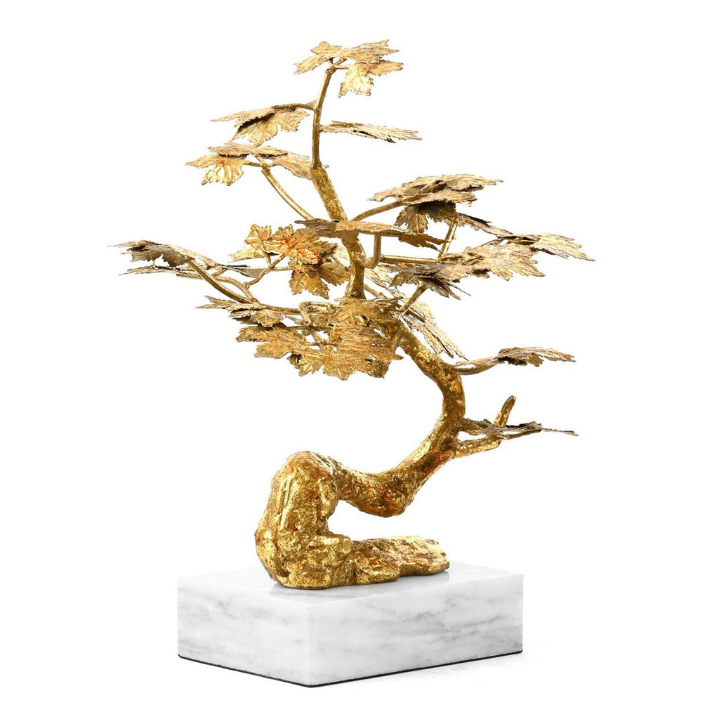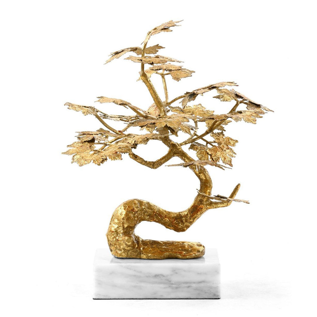 The V&H Tivoli statue is a mature Japanese Maple bonsai in the windblown, Fukinagashi style. Bonsais are a Japanese art form admired for how they are bent to the gardener’s design over many years. They are also admired for the qualities of simplicity, deliberate imperfection and respect for nature. Here, we have a highly cultivated old maple with a gnarled trunk in full leaf. Gilt metal. White marble.
