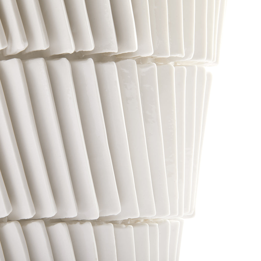 The Vega Vase is a stunning piece with presence. Inspired by the Italian Futurist movement, it is made by painstakingly placing hand-cut fins of glossy Blanc de Chine porcelain in a turbine pattern onto a conical vase. The Vega impresses with a strong presence and can easily support a tall bouquet of flowers or decorative branches with its weight. It makes both a stunning centerpiece for a dining table, coffee table or entryway console.
