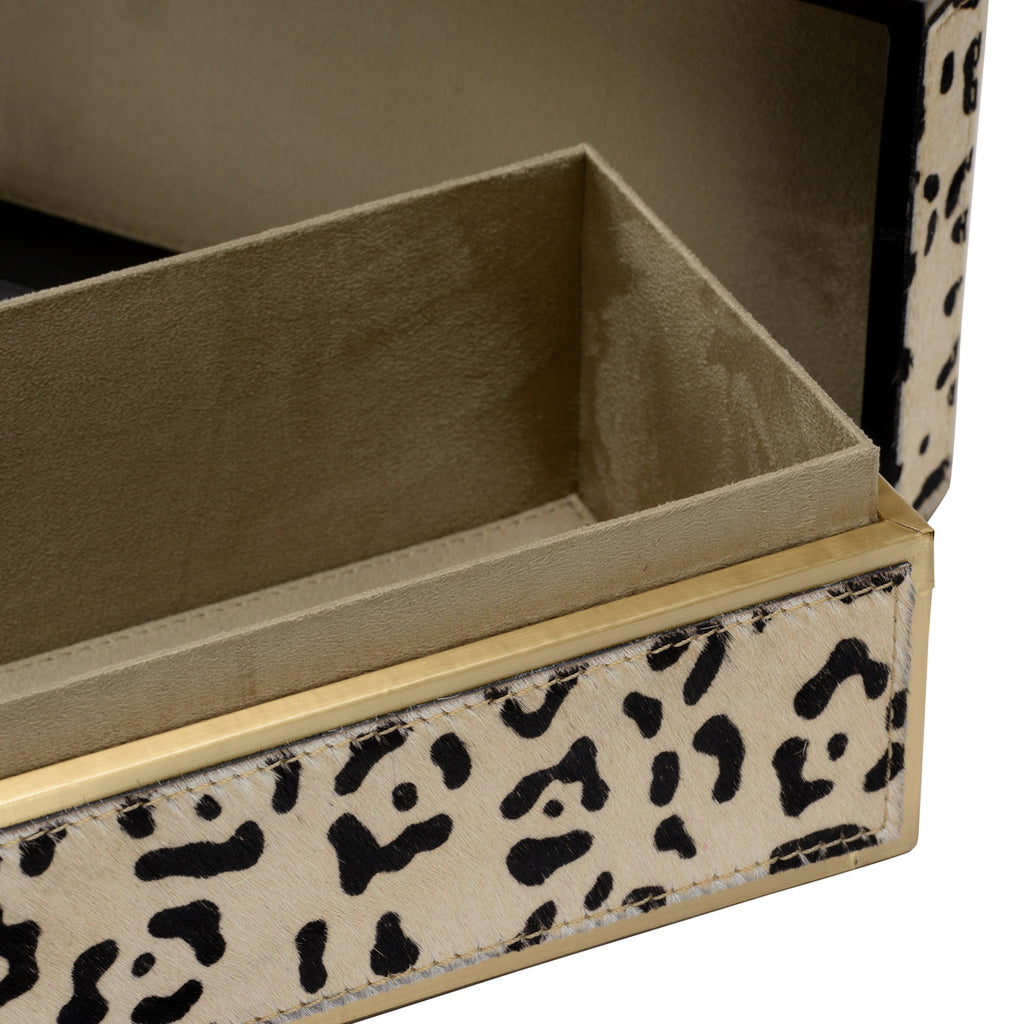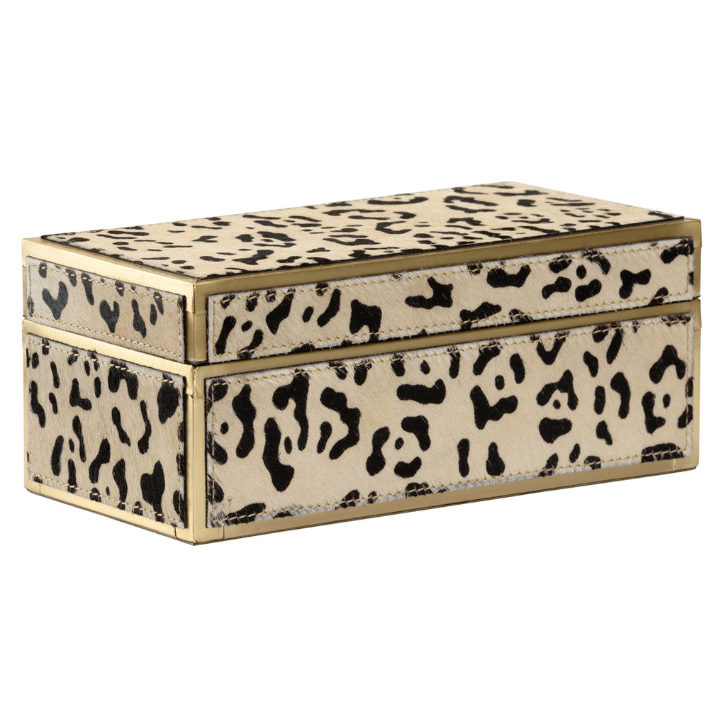 Boasting a bold pattern from the Cheryl Luckett collection for Wildwood is an ideal way to incorporate a chic, modern feel in any decor. Warm brass trim combines with stunning hair on hide creating an accent that is attractive as well as functional. The removable lid and felt lining provide a safe place to store small items.