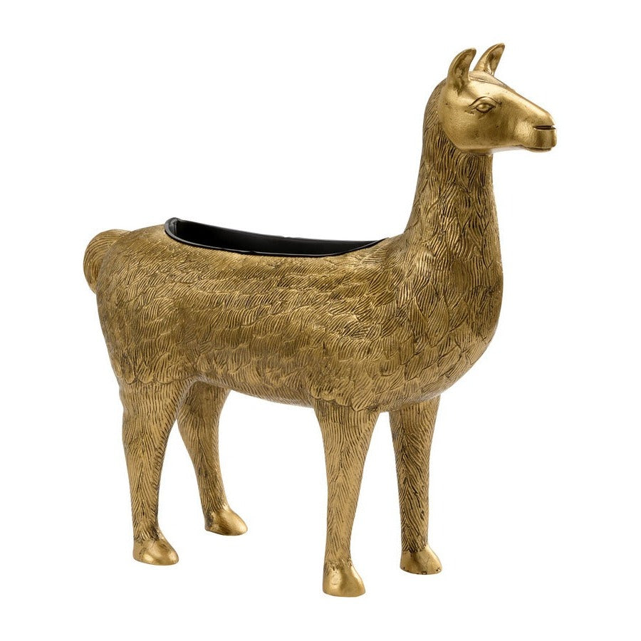 Llama drama planter will greet your guests with its whimsical charm. Crafted of aluminum with a warm antique brass finish, it features a removable metal liner perfect for adding your fresh flowers, your favorite succulent or a trailing vine.