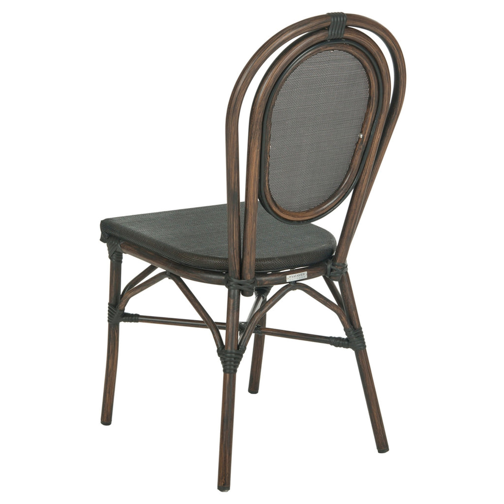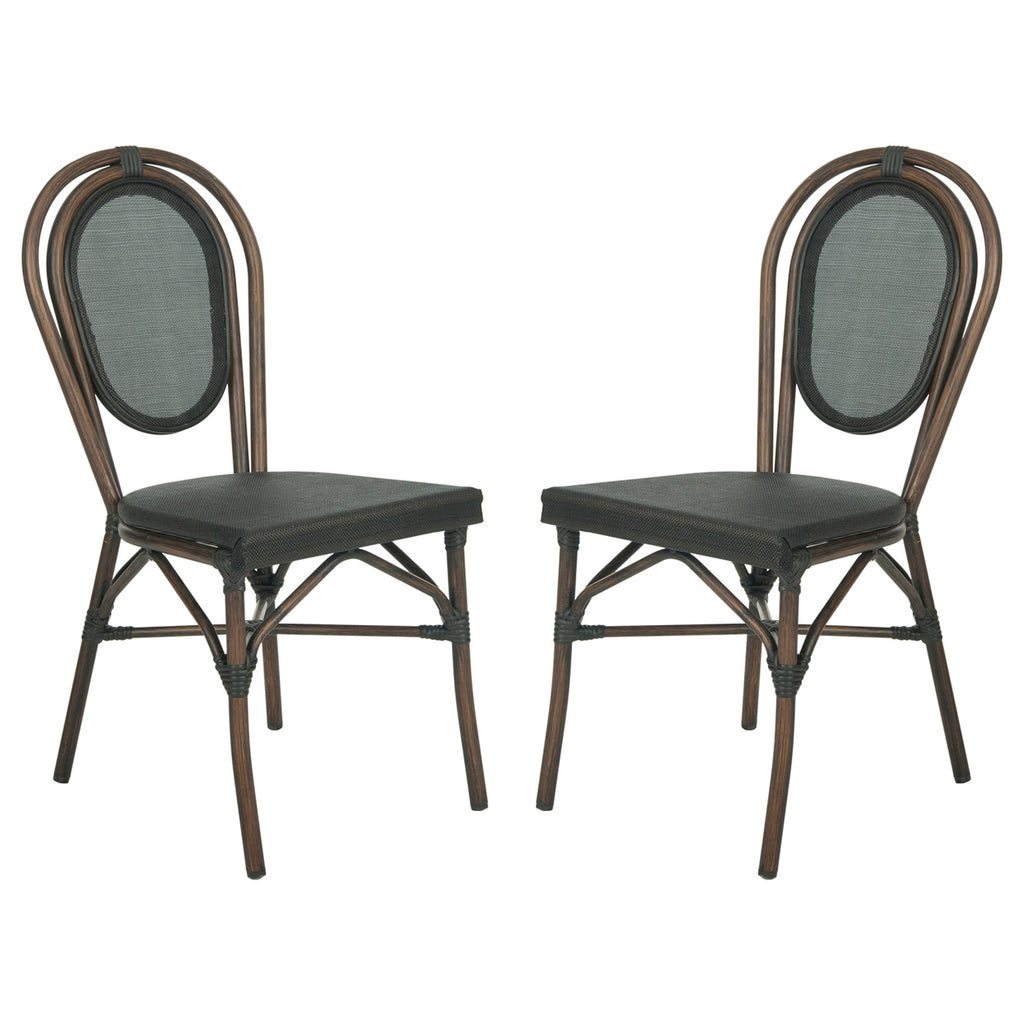 Reminiscent of classic Thonet bistro chairs, this set side chairs is treated to state of the art materials for outdoor use. Crafted with aluminum frame and black Textilene fabric, this easy care design is pretty enough to use indoors. Sold as set of 2.