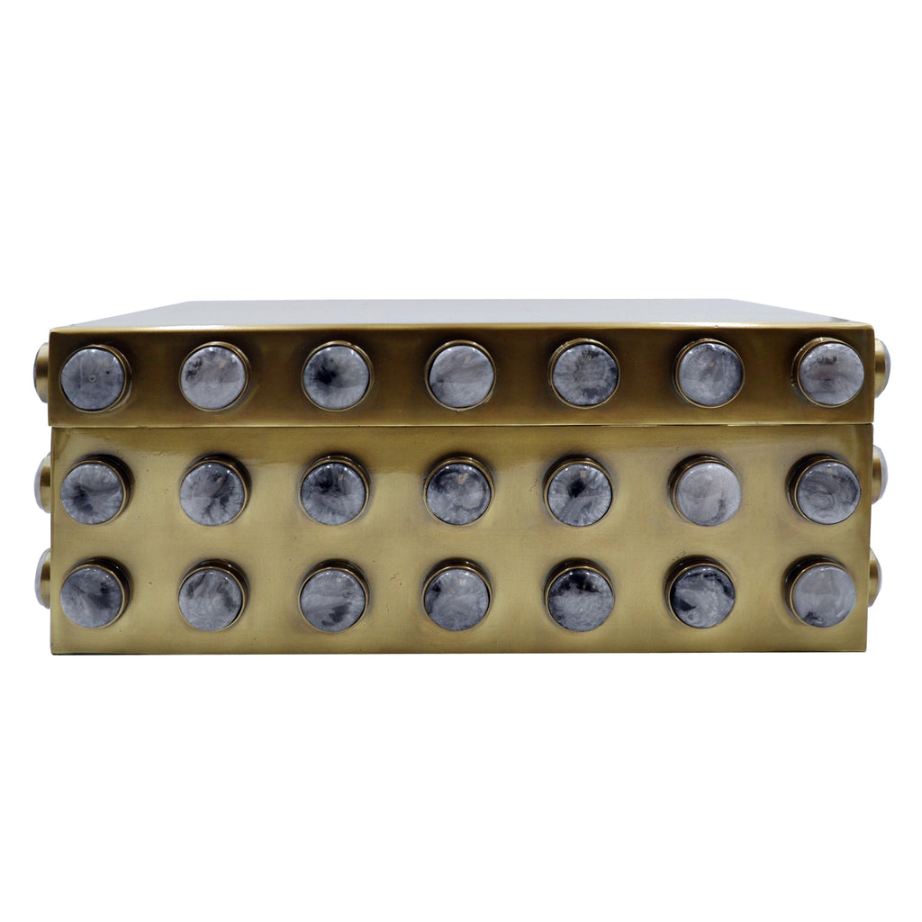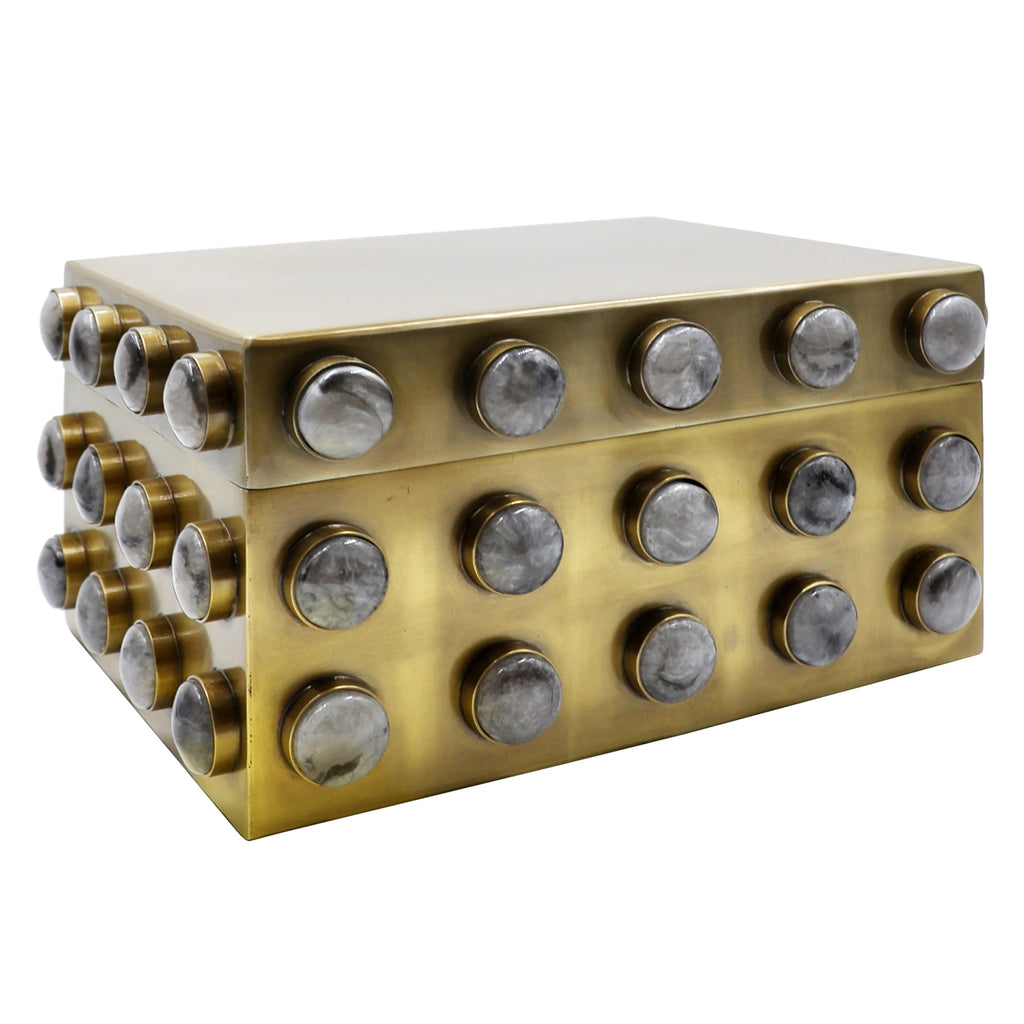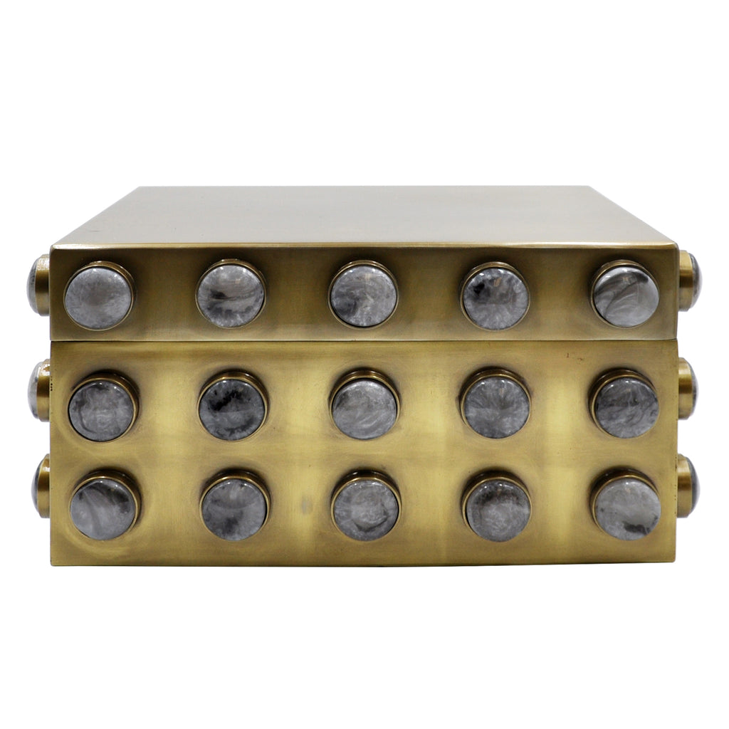 Cool touches of geometric style come to life on this box from Worlds Away. Its unique textures offer an alluring statement, while its sleek lines exude effortless modernity. This accessory delights upon a mantle or side table. Small or large rectangle brass box with resin appliques.