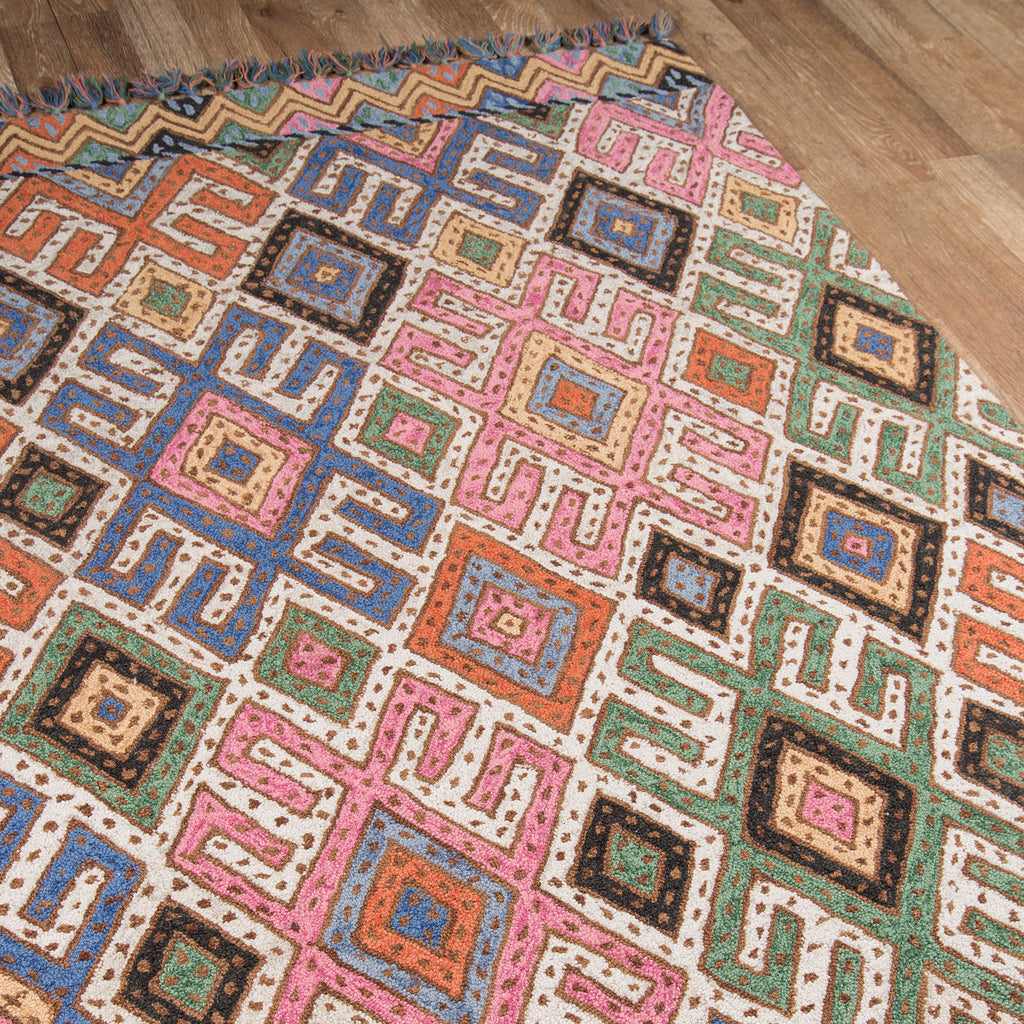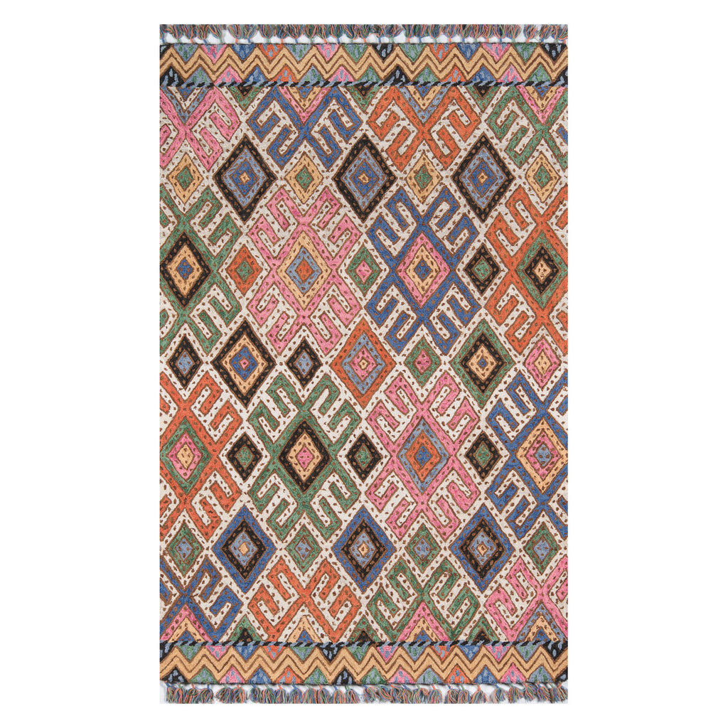 Southwestern motifs get a modern edge in the graphic design elements of this decorative area rug collection. Available in a stunning array of tribal patterns, each floorcovering features a geometric repeat inspired by iconic tribal prints. Diamonds, crosses, medallions and stars form repeating stripes and intricate linework while tassels at the top and bottom of the rug accentuate the exotic vibe of the collection with a fun, fringed border. Exceptional in style and composition, each rug is hand hooked from natural wool threads.