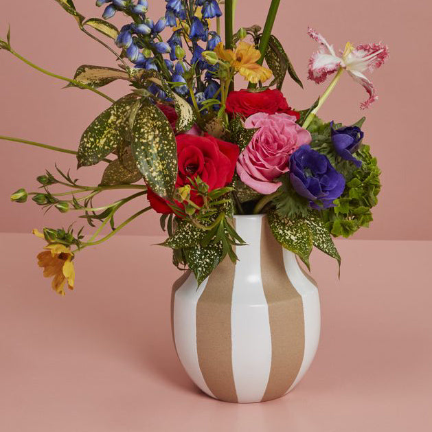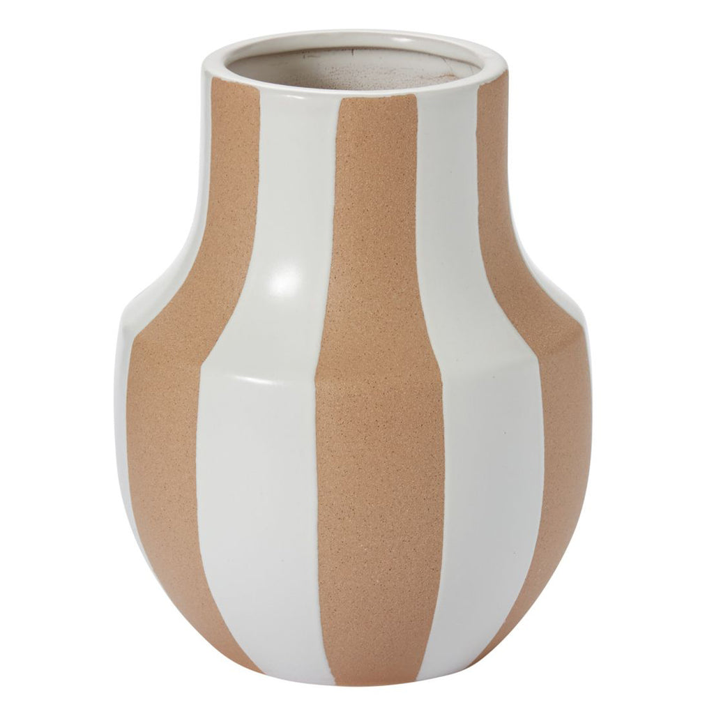 Fill this patterned neutral beauty to the brim with blooms. A modern take on classic design, the ceramic Bonita Vase features alternating smooth white glazed stripes painted onto textural, natural ceramic. A white finished interior protects from moisture. The bold contrast is perfect for bright bouquets at weddings or events, while the size makes this flower vase a florist staple.
