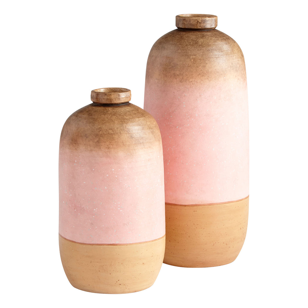 Vases from Cyan Design compliment a bouquet or stand alone on display with distinctive style. These decorative accents add an eclectic feel to contemporary spaces. Rounded contours and a vibrant, gradient ceramic surface lend this vase natural appeal. The rustic Cyan Design Sandy vase sports a bud silhouette with distressed touches, making it perfect for any bohemian aesthetic or modern farmhouse design. The fusion of cream, beige, and red clay finishes combine to resemble a late summer dessert sunset, juxtaposed with a solid brown finish on the container's base. With two available sizes, this accent is perfect for your fire mantle plans, coffee table styling, or entryway console decor.
