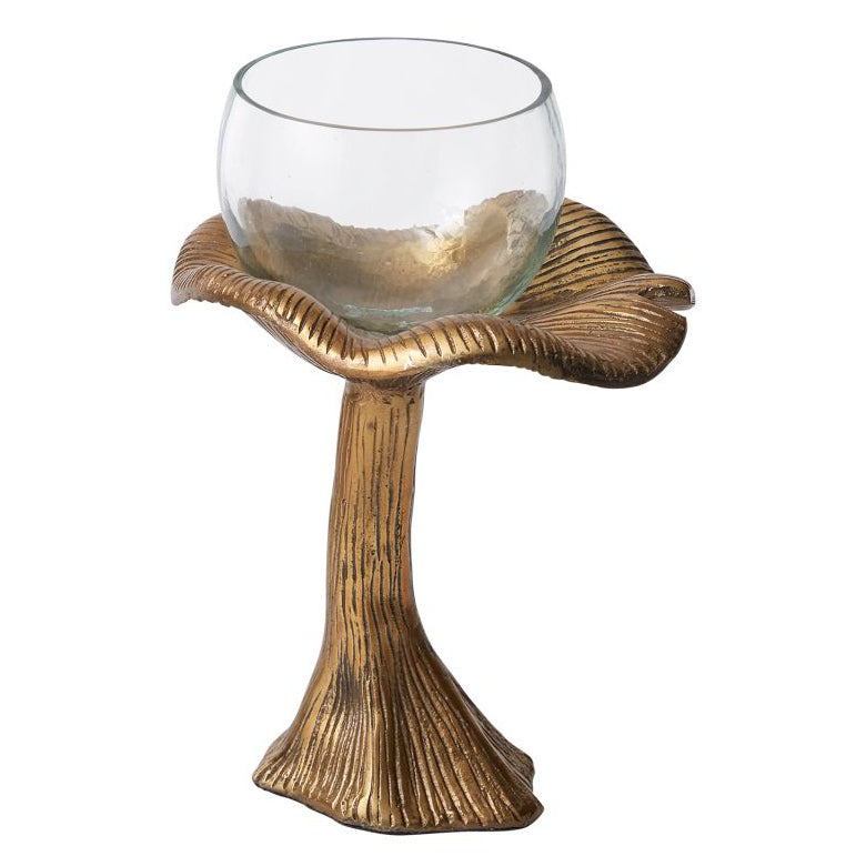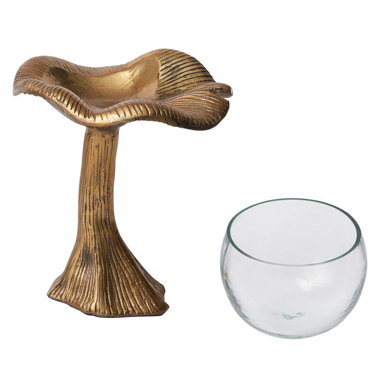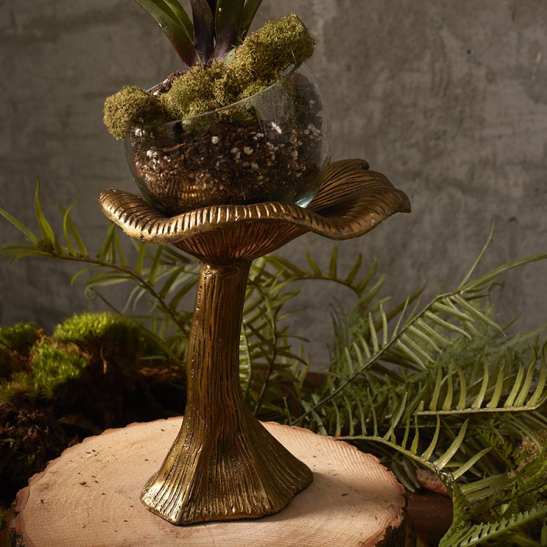 The nature inspired Lichen Planter features a gold metal mushroom base that holds a glass bowl for planting. This fanciful design feels like it sprang up in the forest to hold a dreamy planting.