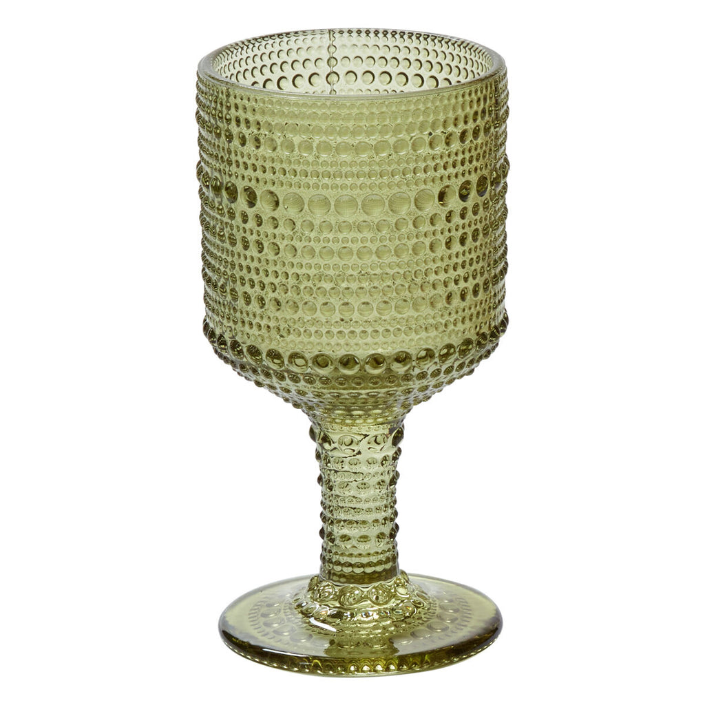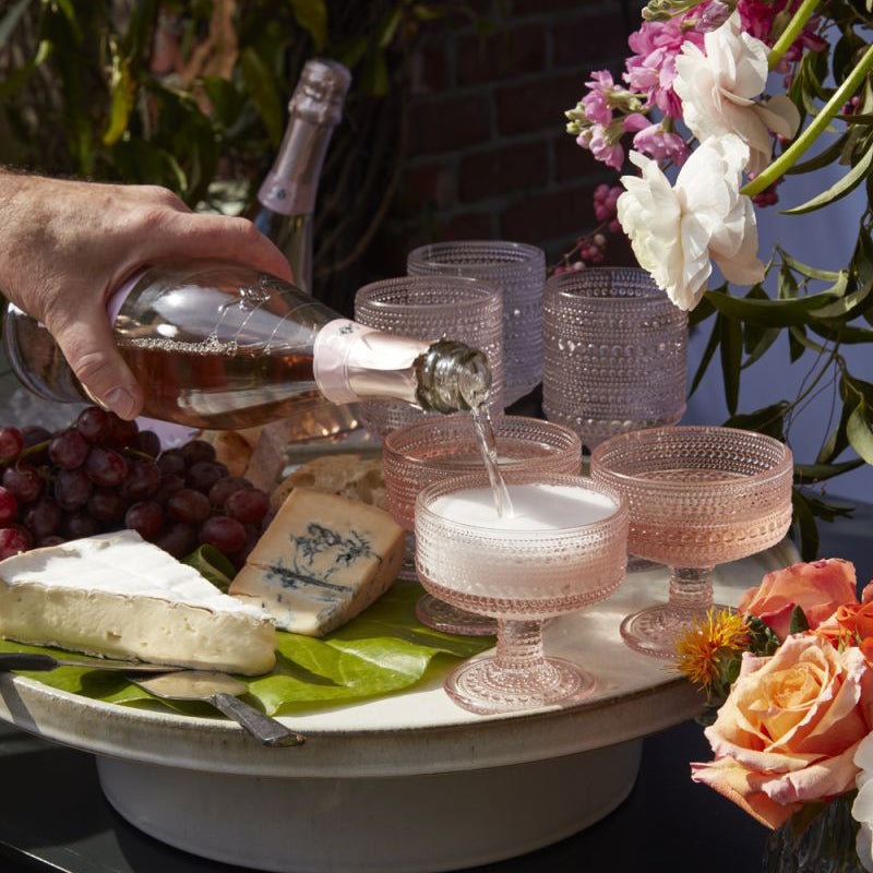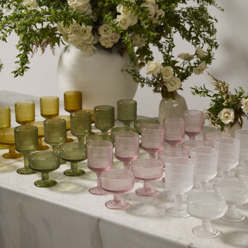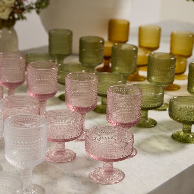 Savor every sip with the Pomona Drinkware. Made from solid, colored glass with a raised dot surface texture, this coupe glass is vintage-inspired with a clean, modern shape. Layer with other Events drinkware for a curated vintage look.