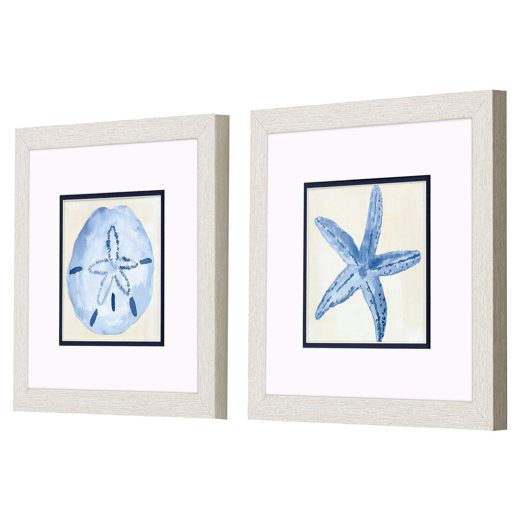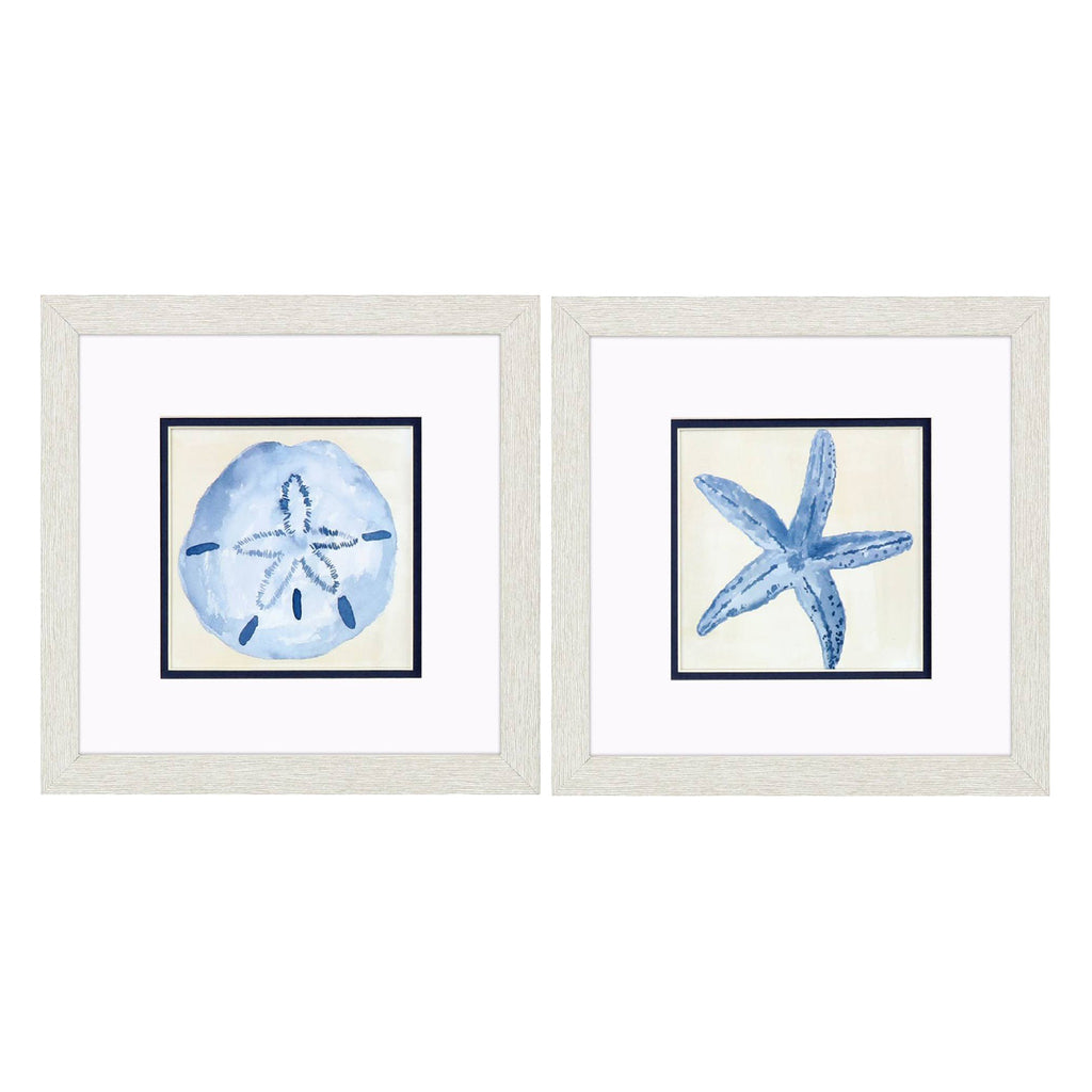 A set of two blue coastal images that are accentuated with double matting. These pieces are framed under glass with a white wash textured frame.