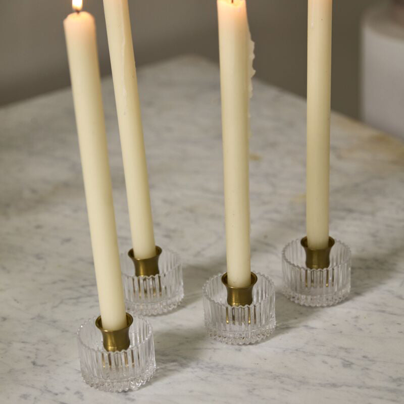 Create a warm centerpiece with a chic blend of glass & gold metal with the set of 4 Serenade Candleholders. These short ribbed clear glass circular taper holders feature a gold metal cup in the center designed for a standard size taper candle, while the glass catches candle wax drippings. These can be styled inside our 4in glass sleeves. Timeless & classic for any style of wedding & event design, this set layers nicely with our votives like the Ritzy.