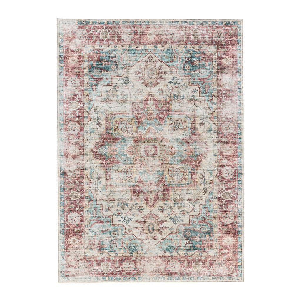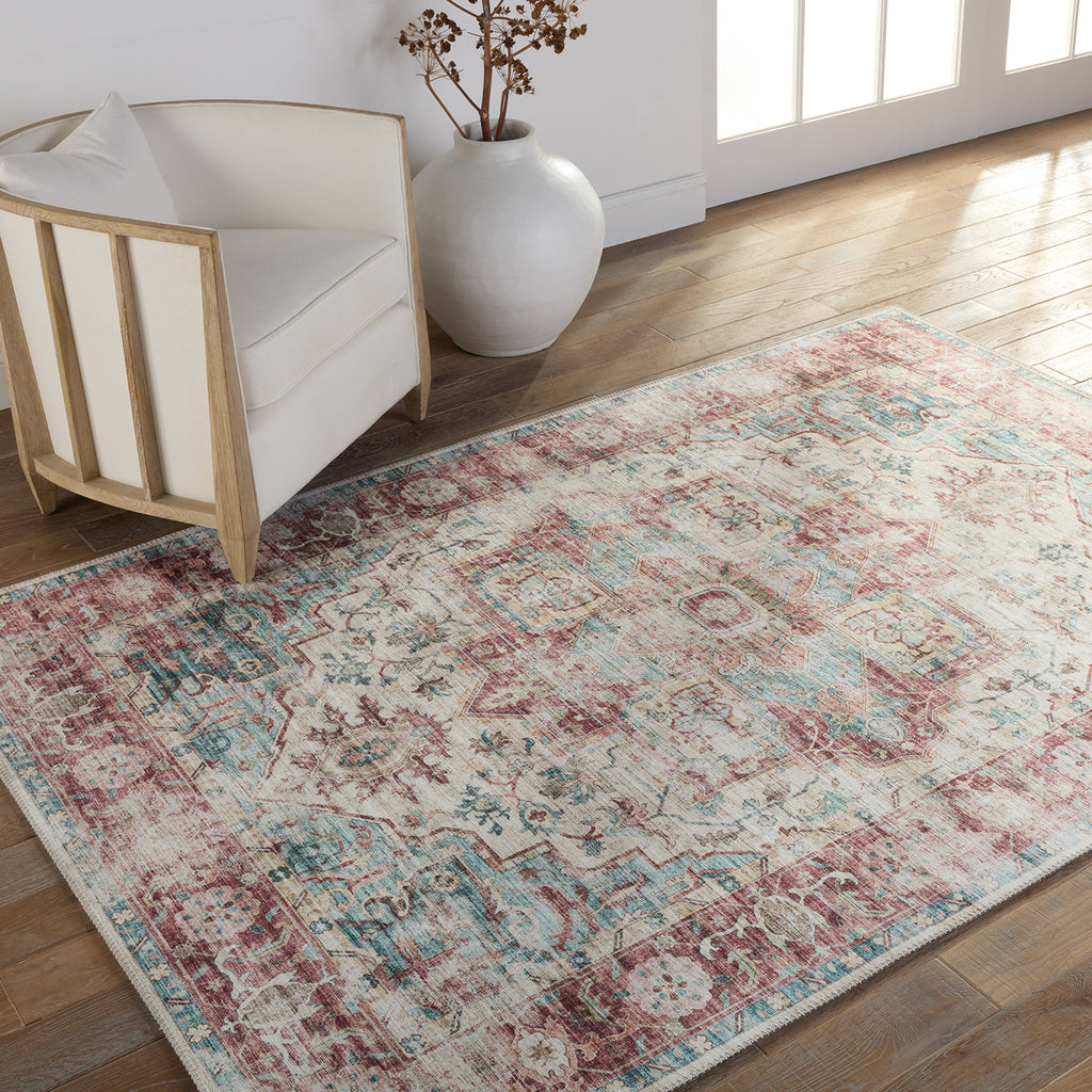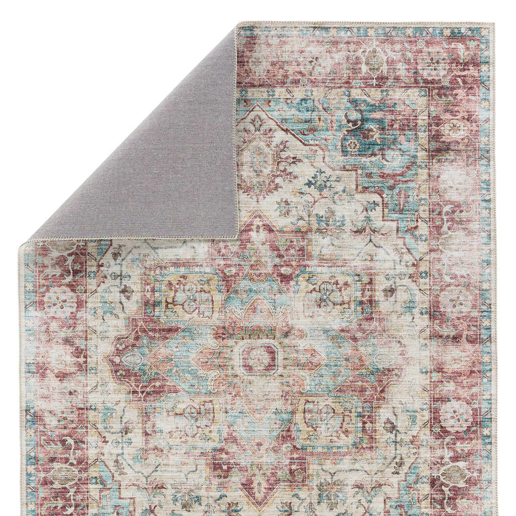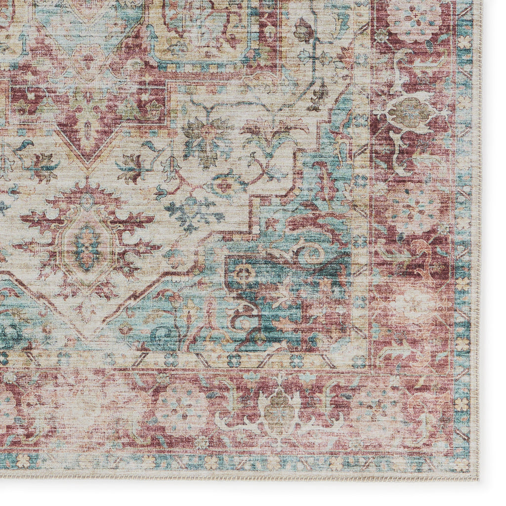 Rich with detail and saturated color, the Vibe by Jaipur Living Kalesi collection makes a statement with updated traditional flair. The Vandran rug showcases a floral medallion in a dark red, teal, beige, and gold colorway that also features hints of green. Crafted of durable polyester, the incredibly high-resolution digital printing gives the impression of a hand-knot quality at an accessible price. This low-profile accent piece can stand up to high traffic areas of the home such as the kitchen, living room, entryways, and halls.