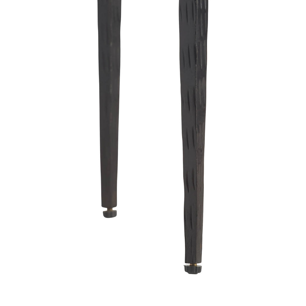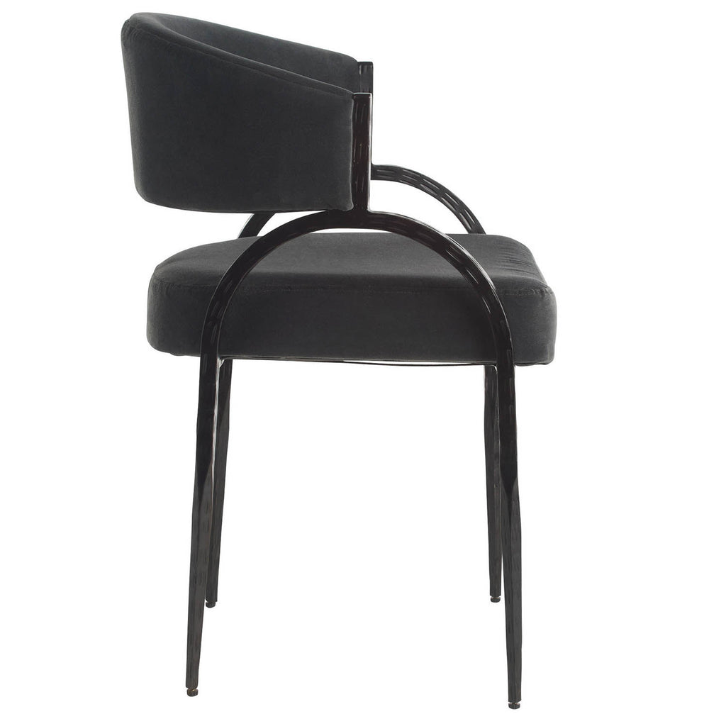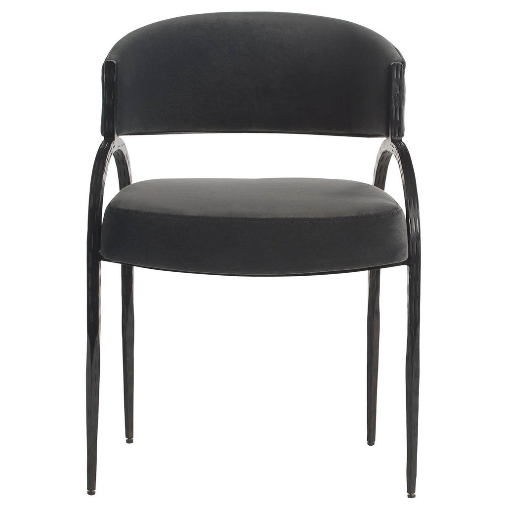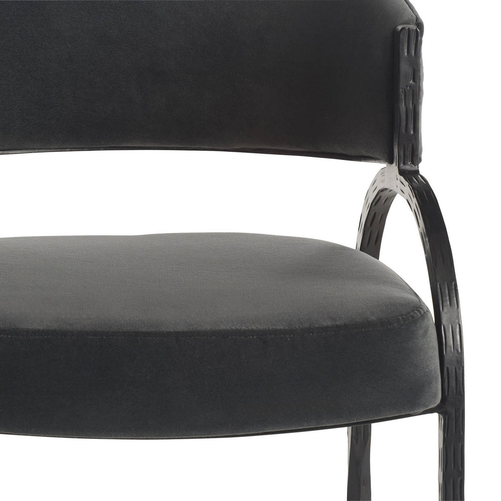 A curved back and large seat rest on a perfectly poised hand-forged iron frame. Upholstered in Midnight Grey performance velvet, this Bahati chair offers both structure and softness—finish will vary.