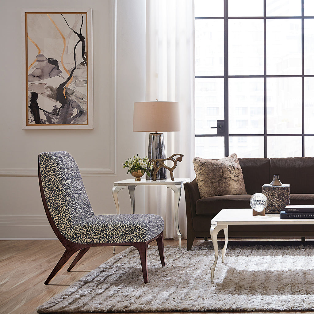 Enjoy the sleek and plush tight-seat, tight-back Bella Slipper Chair with a wood-framed curved back in pairs in your living space, as a dining host chair or a single accent chair. Finished in Caviar, a deep translucent tone on rich Cathedral Cherry Veneers.