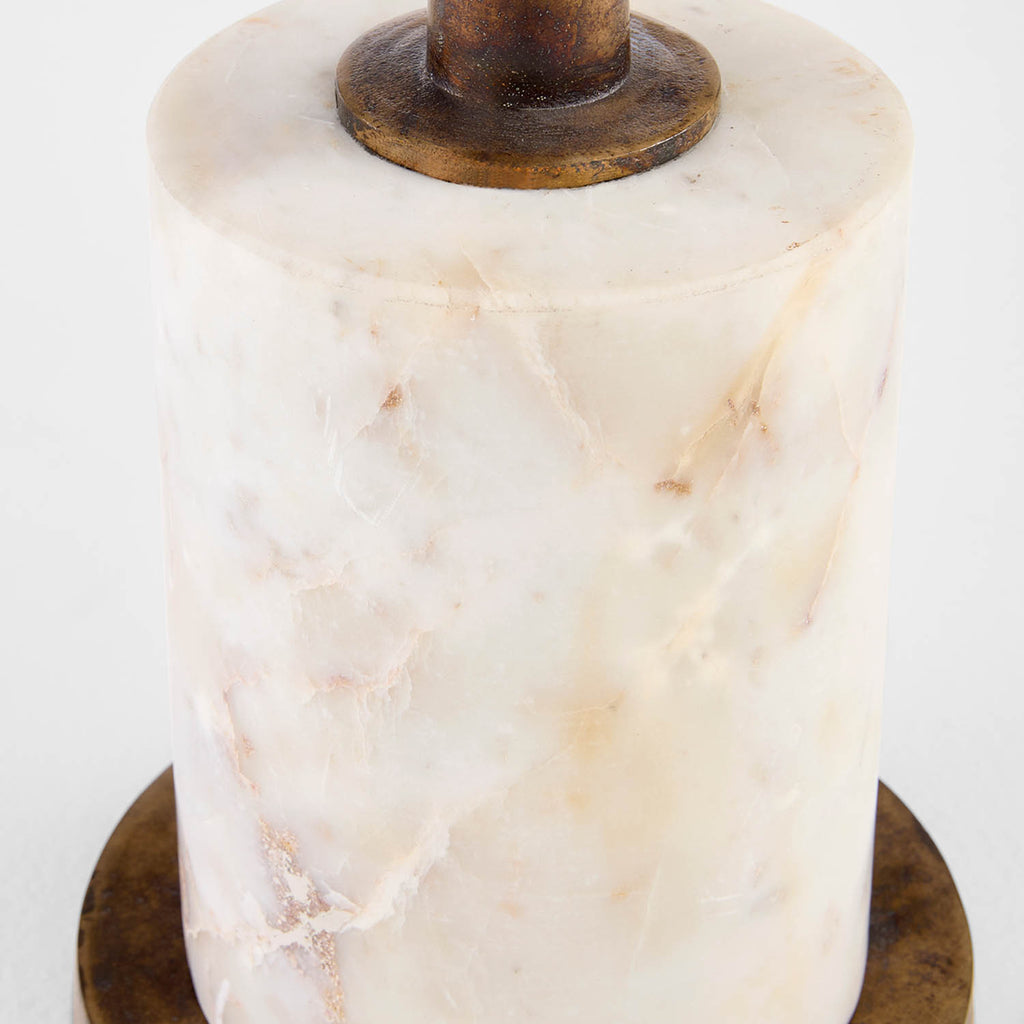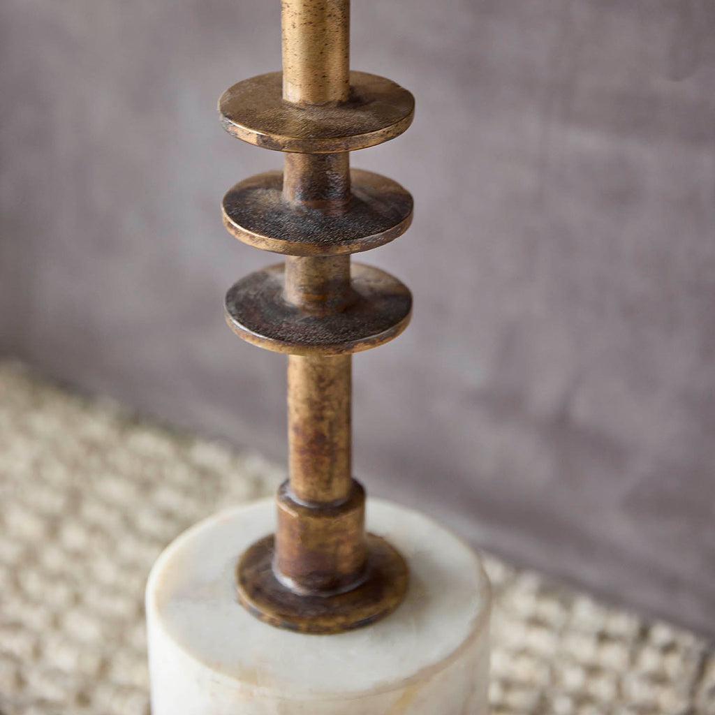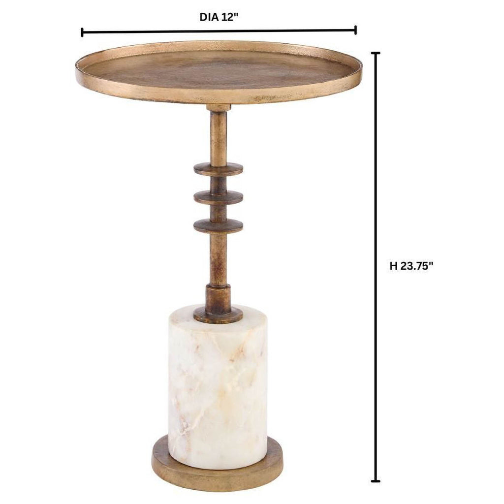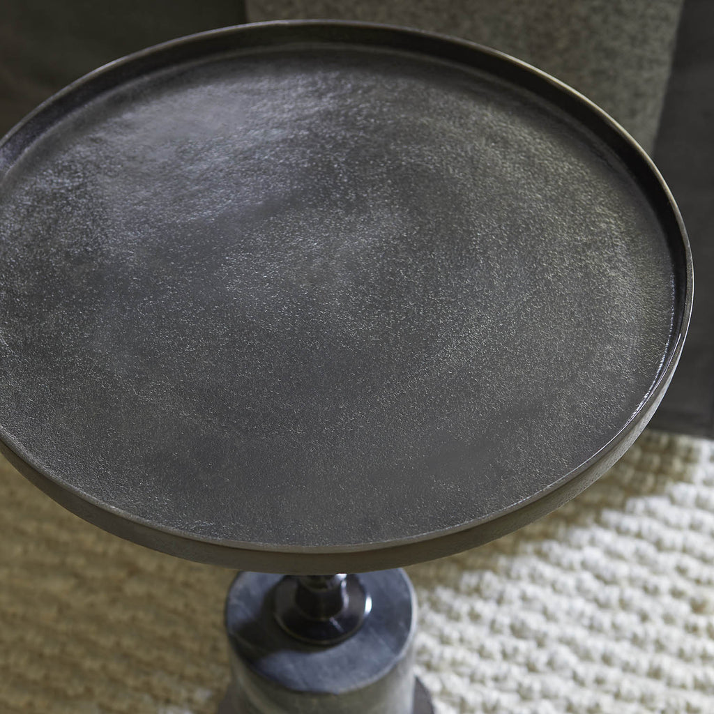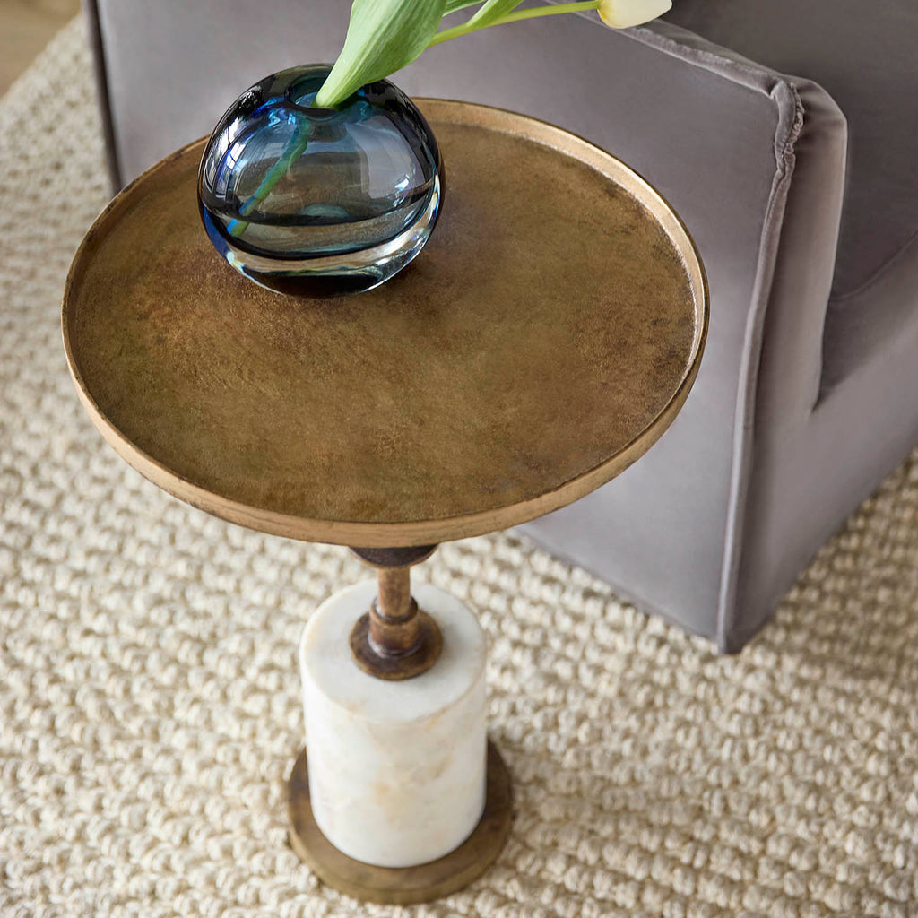 The Jetson table’s rustic blackened nickel or antique brass top and stem provide a striking contrast to a smooth, polished marble base. The table’s rough-cast tray top exudes a sense of tactile charm, invoking a handcrafted feel that’s both inviting and unique. Its heavy Kayampura marble base not only provides stability but also enriches the table’s overall aesthetic appeal.