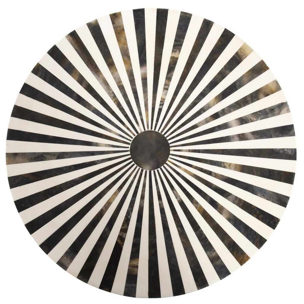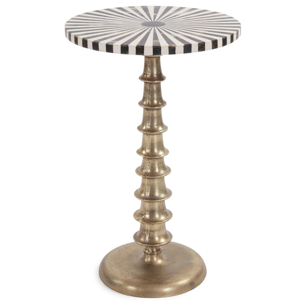 Bone inlay became one of the hottest trends in home decor. Originating in 18th century Japan, the intricate patterns and techniques have been considered valued works of art through the ages. Here we have applied this technique to our Antique Brass Martini Table. The Aluminum base is finished in an antique brass and topped by a round brown and white bone inlay top. Its small footprint makes it the perfect table for small spaces.