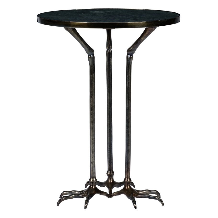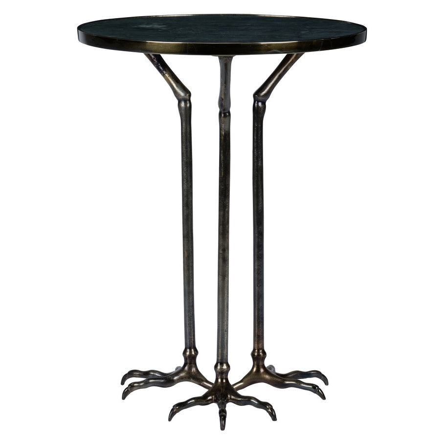 This whimsical and sophisticated side table features bird footed legs finished in antique brass and paired with a natural green marble top.