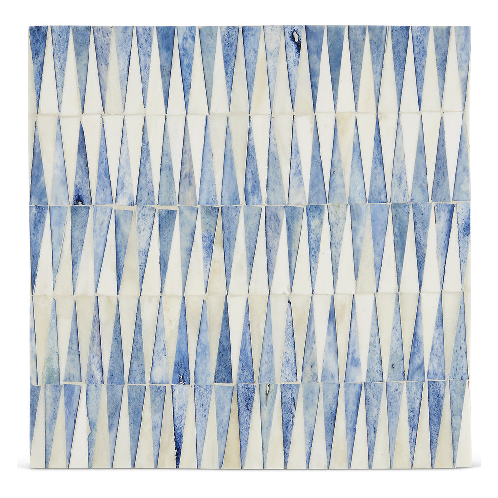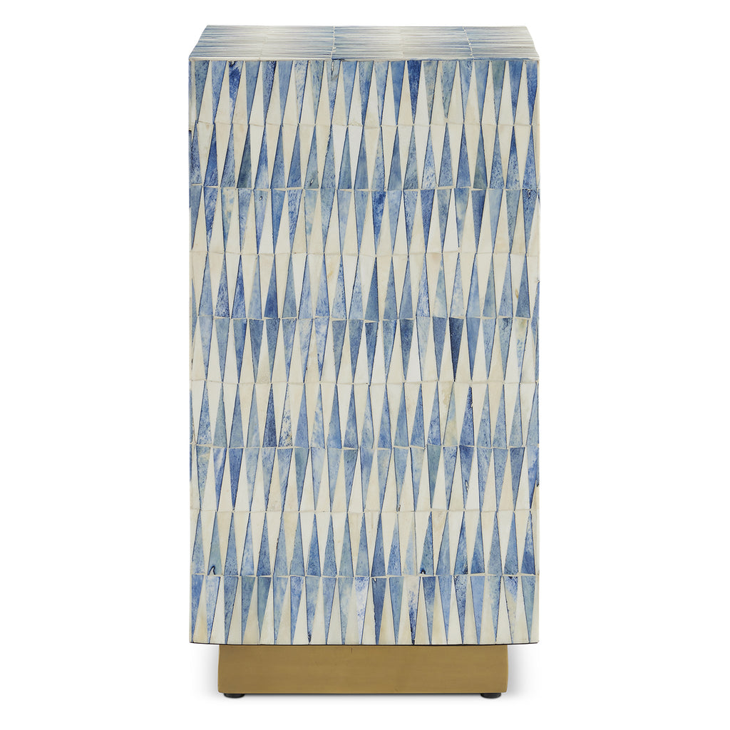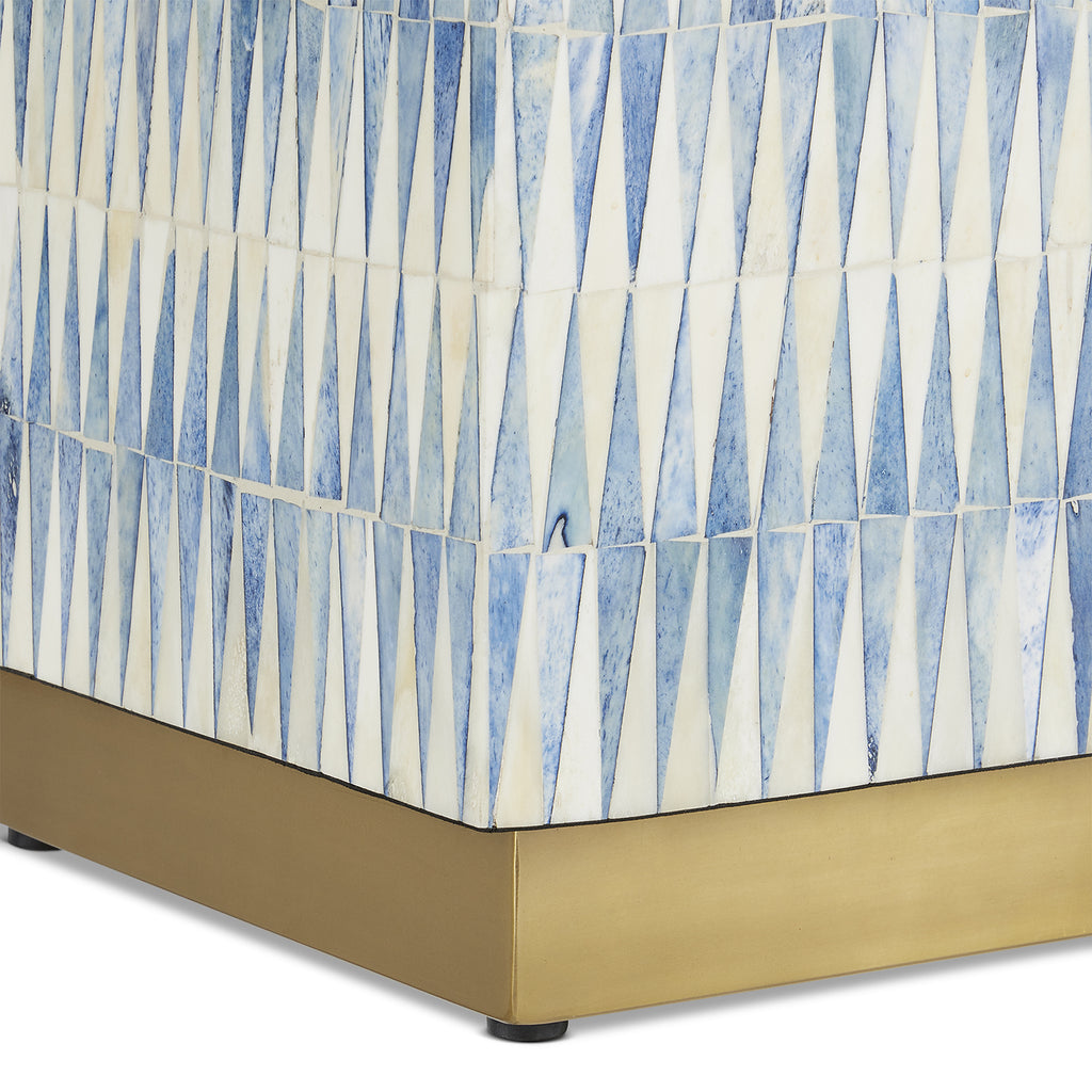The Nadene Blue & White Accent Table is a decorative side table made of alternating colors of bone. The jagged pattern is created when blue and ivory bone are hand-applied to the surface, which makes the blue occasional table an artisanal accent that packs a textural punch. The lovely square accent table sits atop a brass plinth base that adds to its sophisticated profile. This complex composition was designed by Aimee Kurzner.