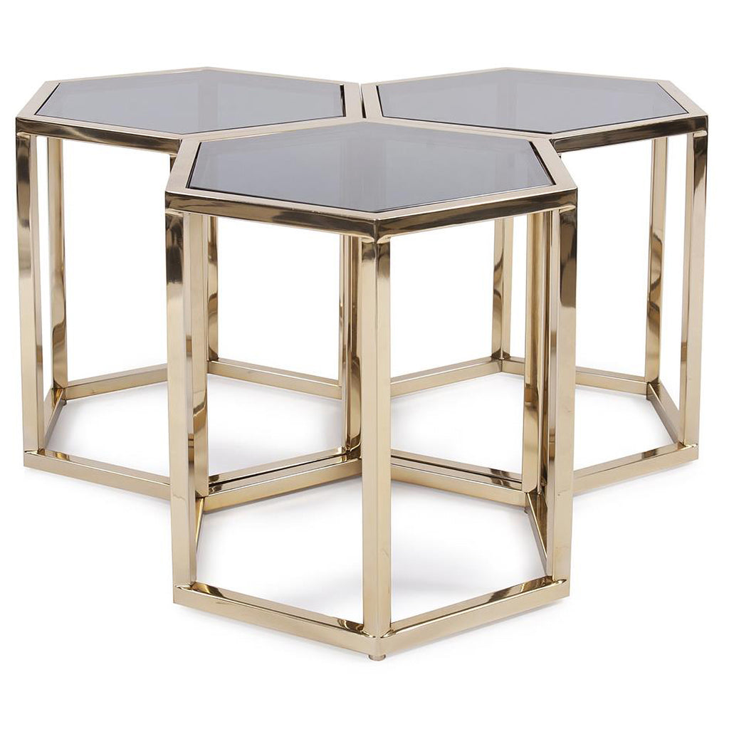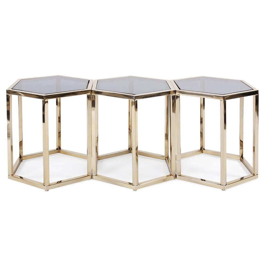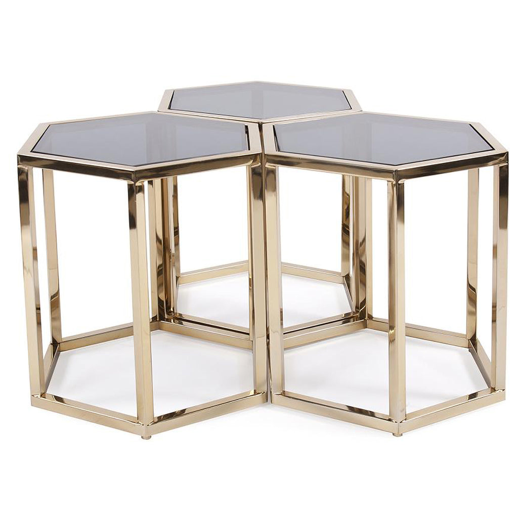 Everything is better in 3's! This set of hexagonal tables can be used together or separately around your room. The stainless steel frames fit perfectly together to create a larger table. They feature a polished gold finish topped with black tempered glass surfaces. 3 identical tables are included in the set.