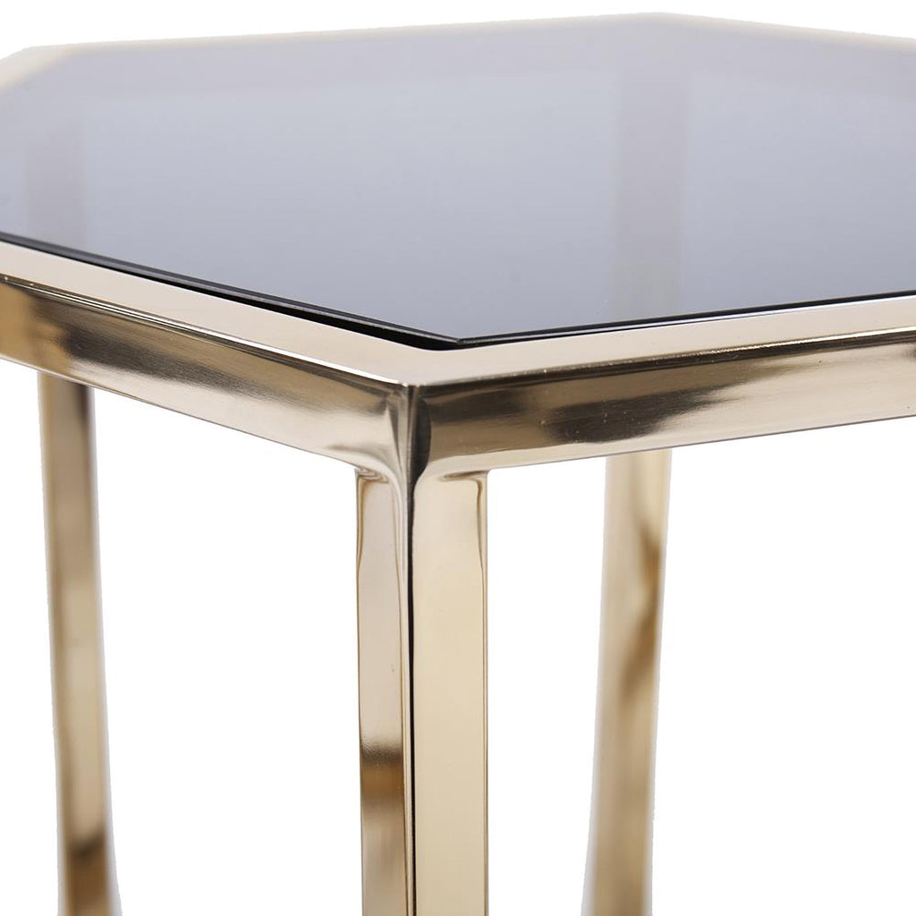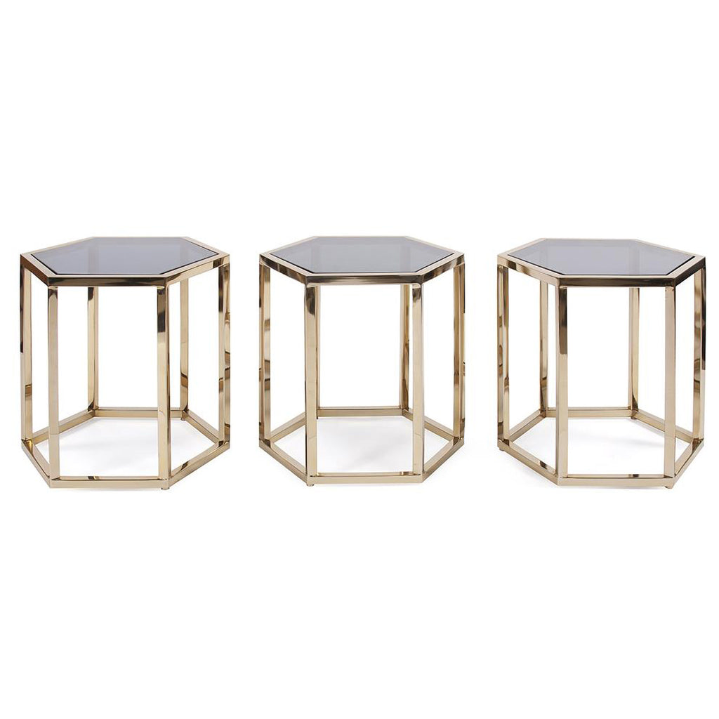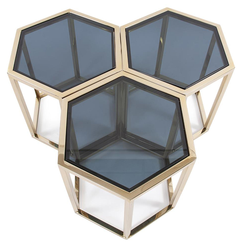 Everything is better in 3's! This set of hexagonal tables can be used together or separately around your room. The stainless steel frames fit perfectly together to create a larger table. They feature a polished gold finish topped with black tempered glass surfaces. 3 identical tables are included in the set.