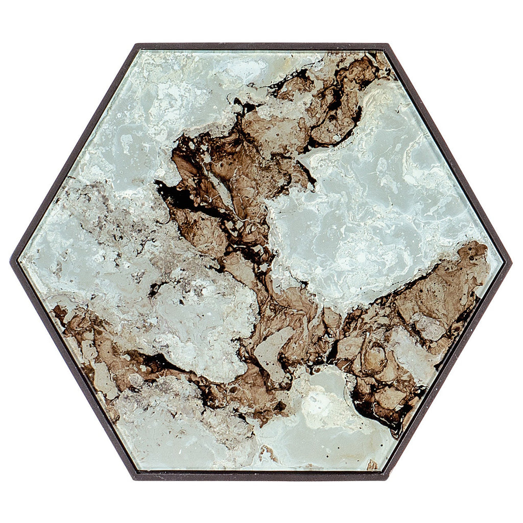 Artistic and airy, the Commerce Market Accent Table has a lightly-scaled metal base and a reverse-painted glass top in color tones of earthy brown and graphite.