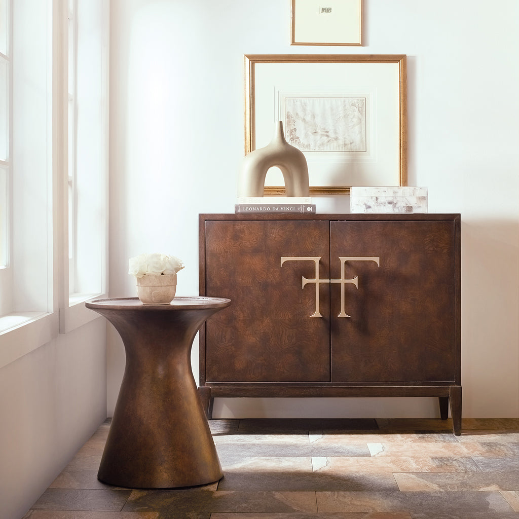 In a hand-forged, craftsman-like design, the Barron Accent Table is offered in an hourglass shape and textured brown finish with distressing and a raised edge on the top. While large in style, it is a compact 20 inches round.