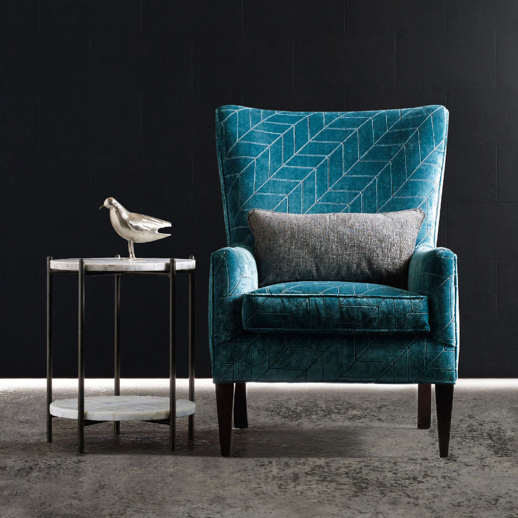 Industrial meets organic with the chic and couture Blythe Accent Table, combining an alluring White Onyx top and bottom shelf with patterned veining with 5 slender metal legs. At only 18W by 18D, this versatile piece will add character even to small spaces.