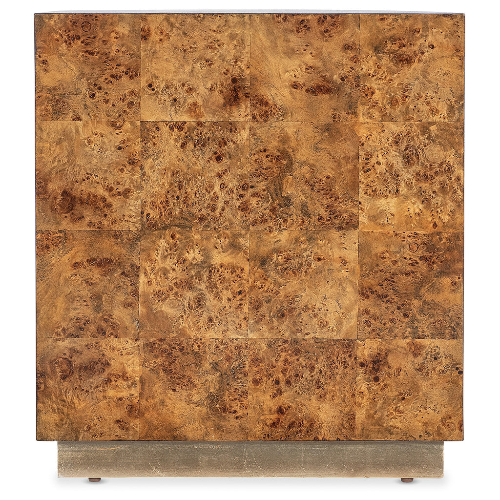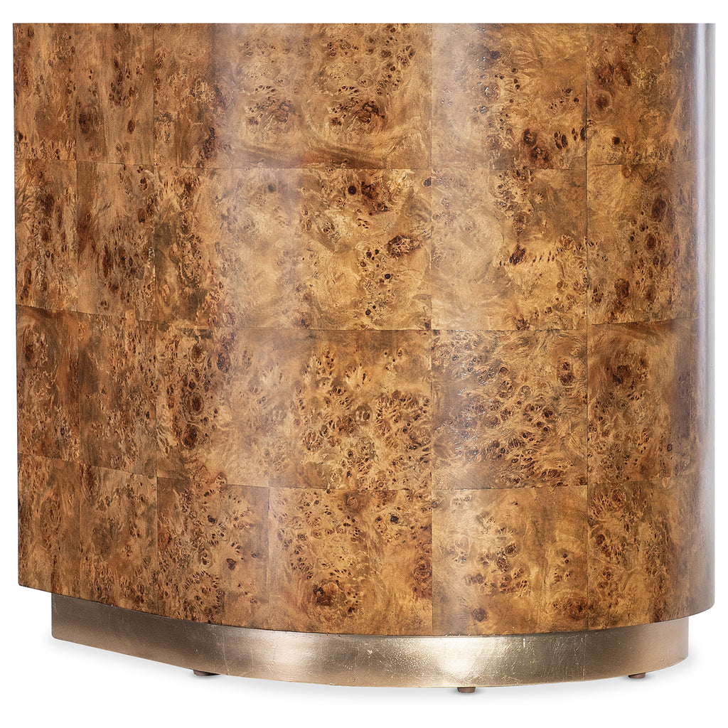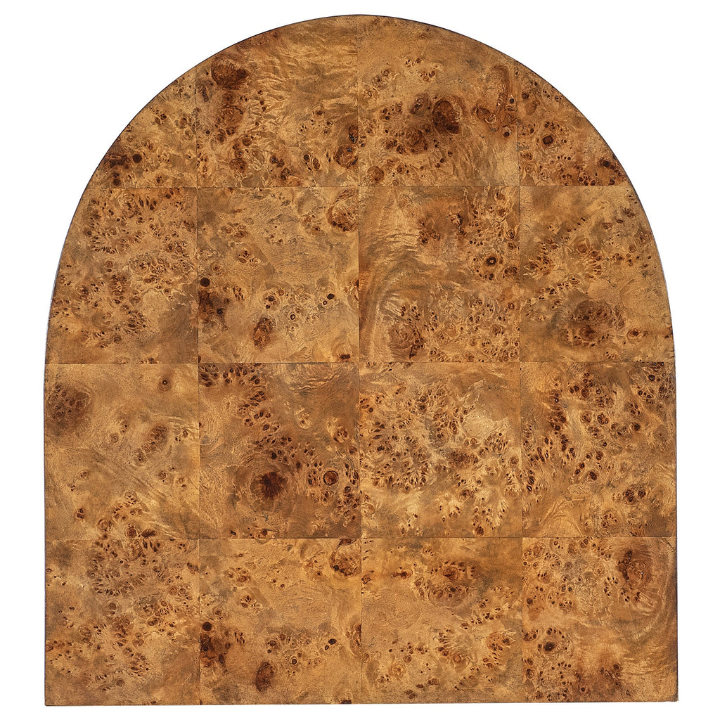 Earthy and intriguing, the Burlesque Accent Table is crafted of Mappa Burl Veneers in a tiled pattern over a silhouette that has one flat side and one rounded side to create a half-oval shape. Measuring 24 inches wide by 22 inches deep, it has a warm golden finish and gold plinth base.
