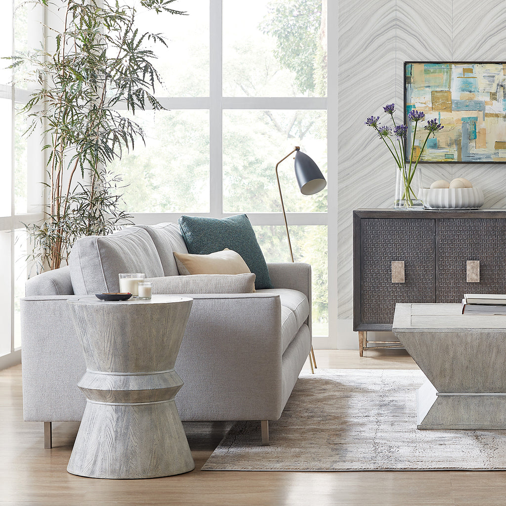 With a chunky hourglass shape and contrasting stone-like resin top, the Korena Table has a casual organic look and a serene gray wood finish.