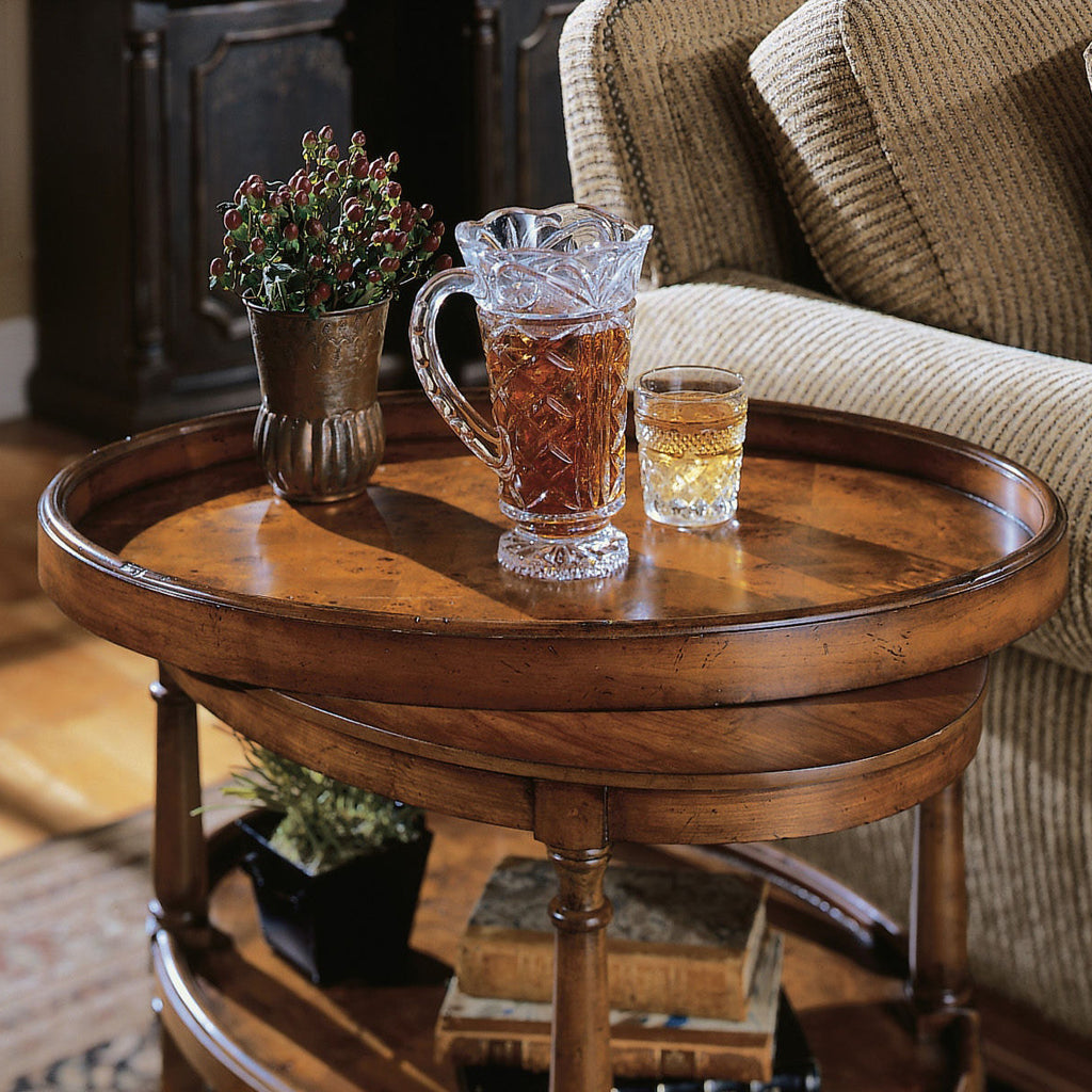Extend hospitality in style with the lovely oval accent table with a removable serving tray on the top. Crafted of Mappa Burl with decorative veneers, the piece has 2 shelves and brass end caps on the legs.