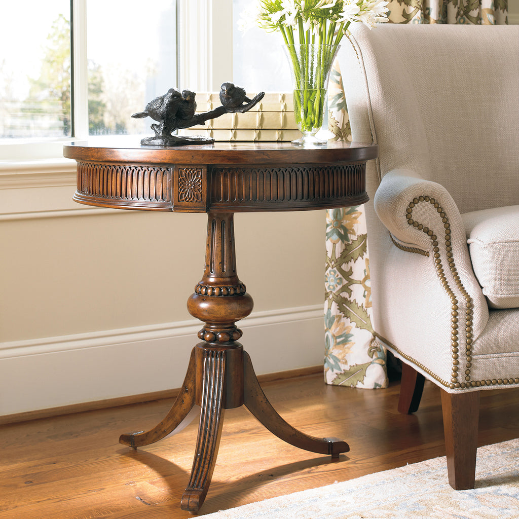 In a vintage 18th Century pedestal table design with pie-shaped top, this piece exudes character with classic fluted, beaded and flared legs.