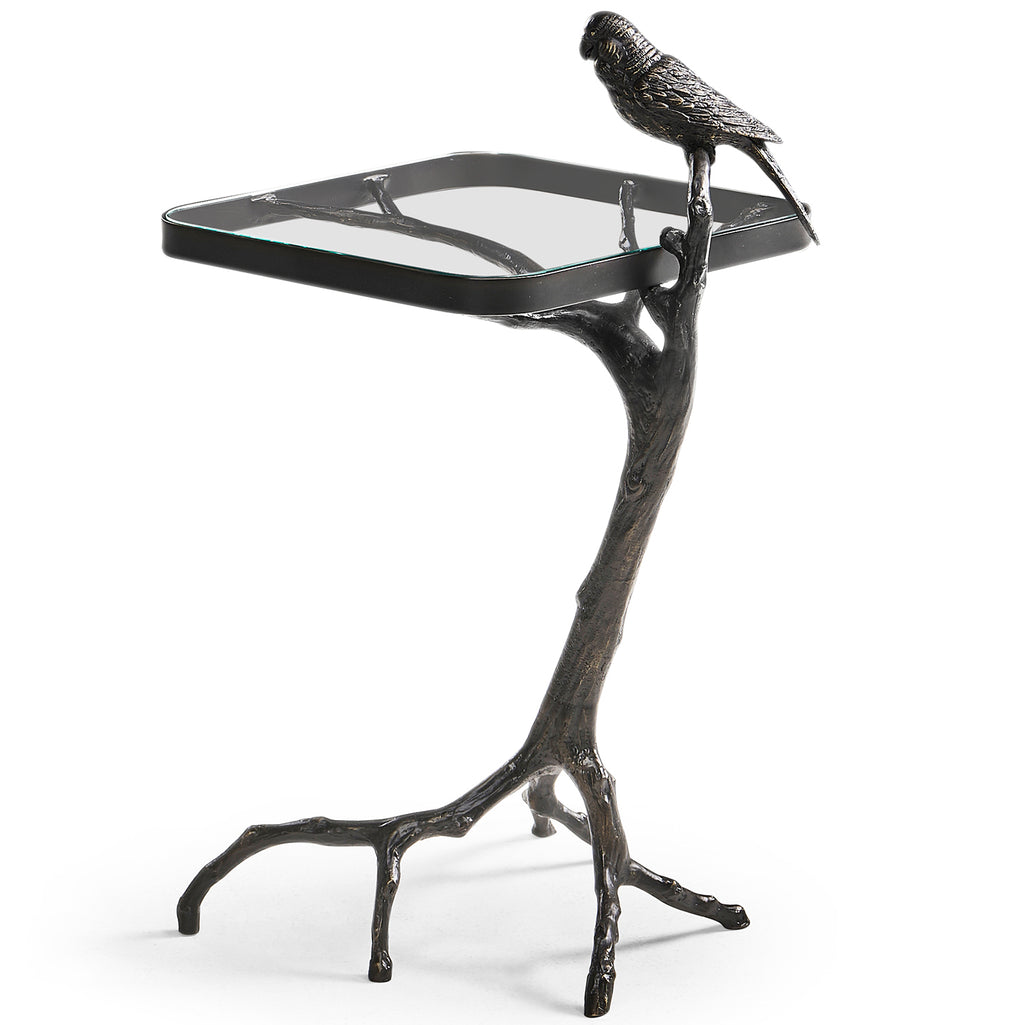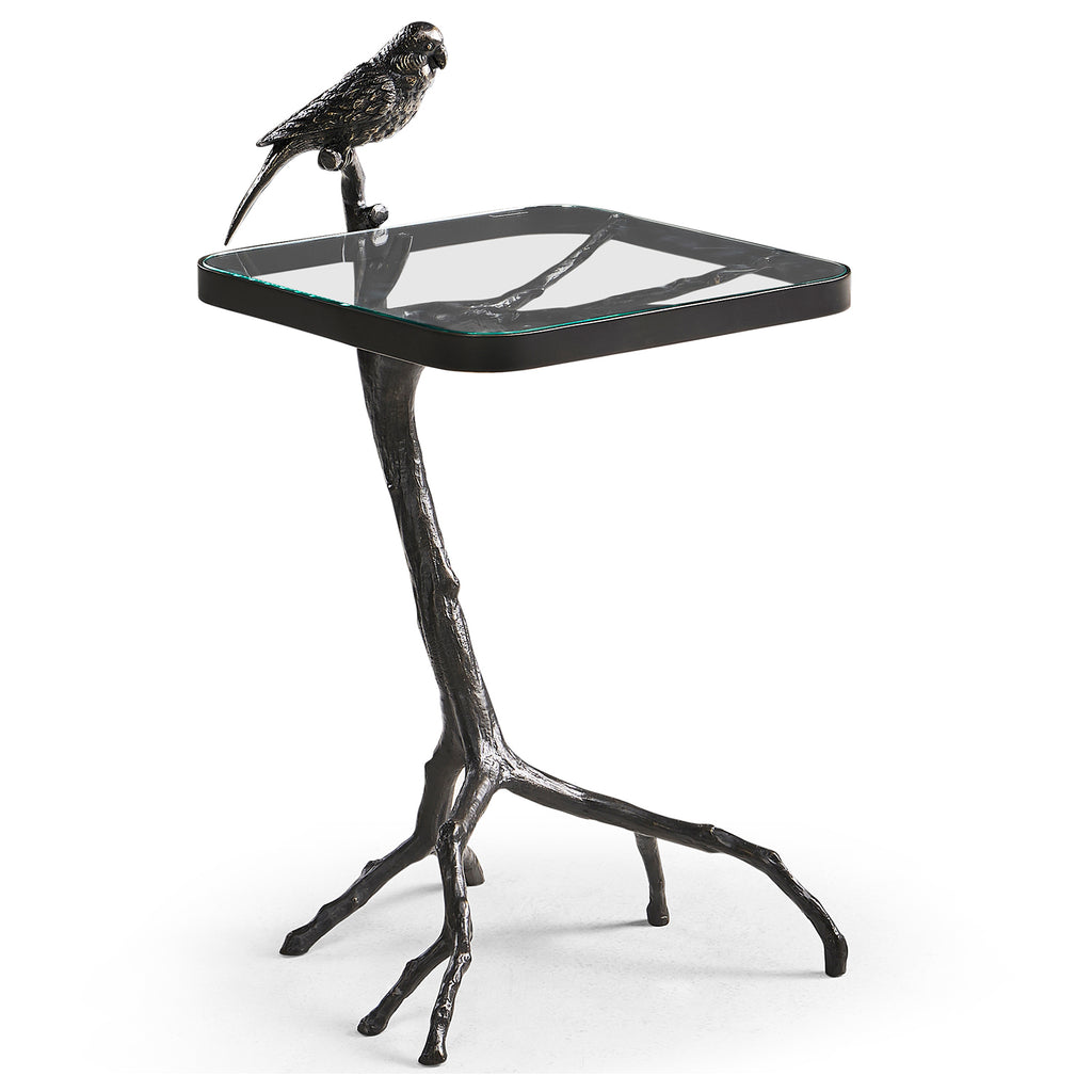 Inspired by nature, the Mendenhall Accent Table is a captivating blend of artistry and function. Its bronzed iron base, designed in an intricate branch motif, brings an organic elegance to the room. Perched atop the glass tabletop is a delicate bird sculpture, adding a whimsical and sculptural touch to the design. The clear glass surface beautifully showcases the intricate detailing of the base, making this accent table a true