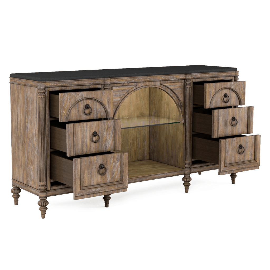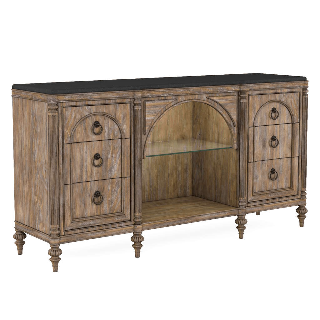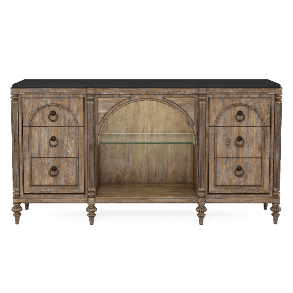 Step across the threshold of a new design frontier with the Architrave collection. Based on an architectural term that refers to a frame surrounding a doorway, this collection symbolizes a transition from history to the future. Architrave is historically inspired, reinventing the strong lines and classic symmetry of Neoclassical style from the Louis XVI period in France. The striking design of the Architrave Server borrows details from 18-century neoclassical architecture, including a trio of arches and fluted Roman column details. The result is an eye-catching addition to any dining space, highlighted by interior touch-operated LED lighting and an adjustable glass shelf that showcases china and display items in a soft halo of light. A honed black stone top provides a touch of sophistication, balancing the casual rustic pine finish for a look that's equal parts elegant and laidback.