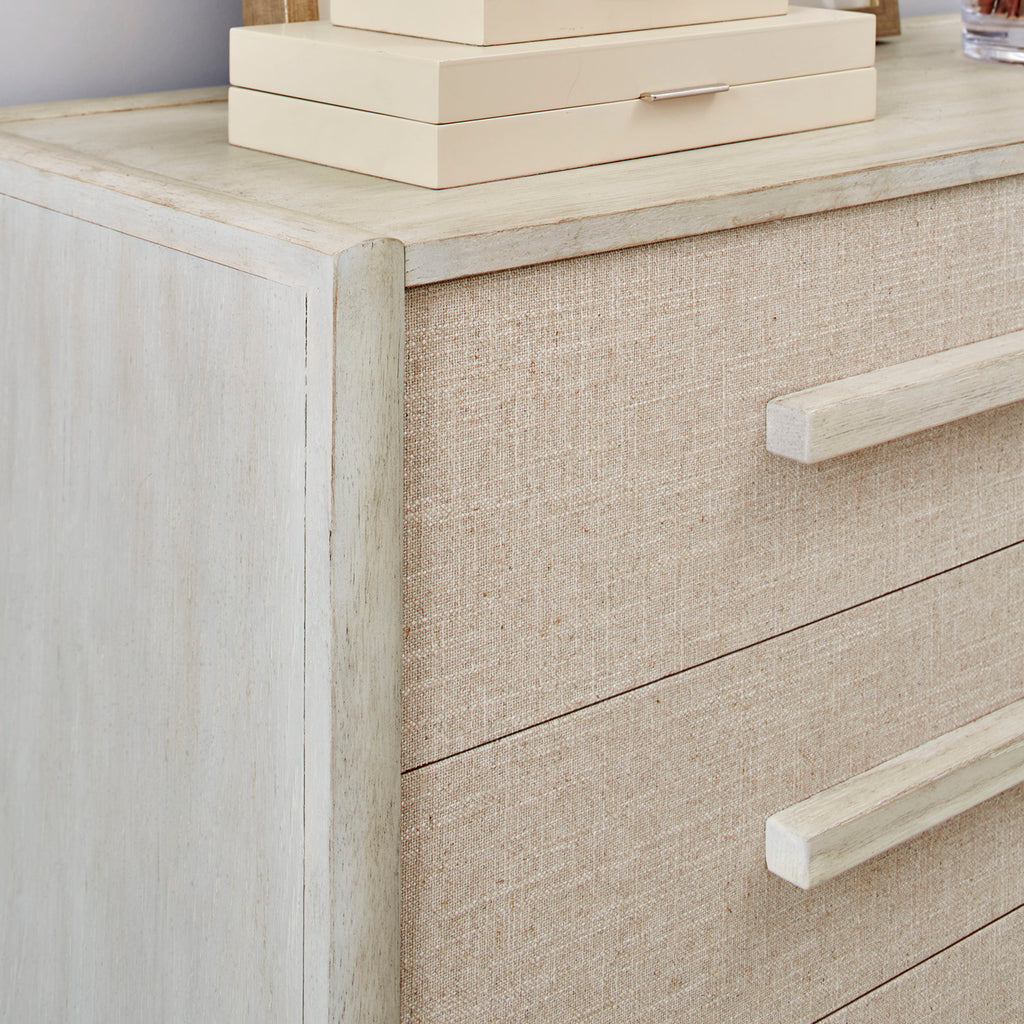 • Drawer-fronts wrapped in a linen-blend fabric with a performance treatment.