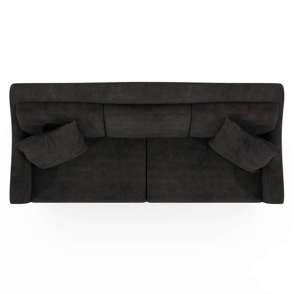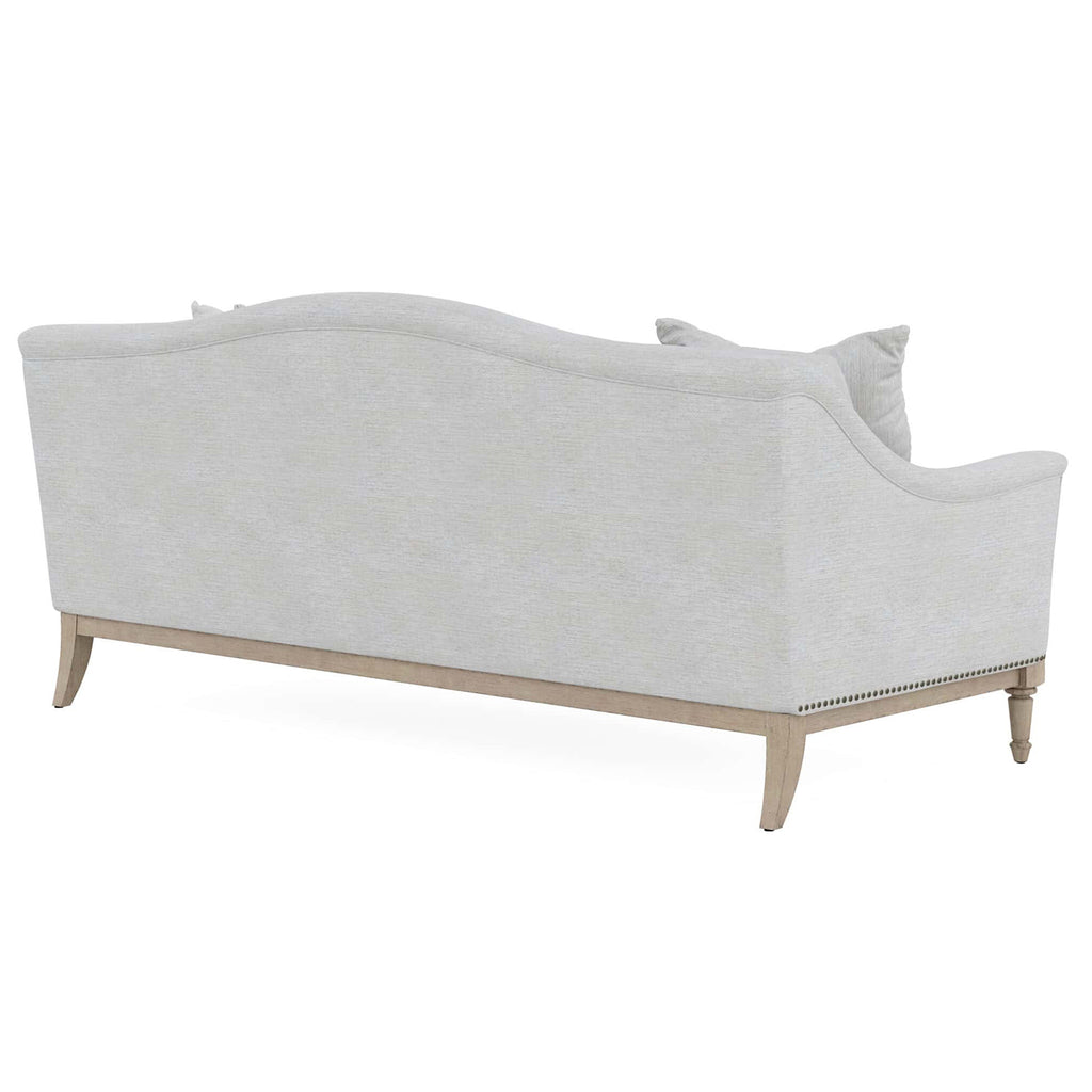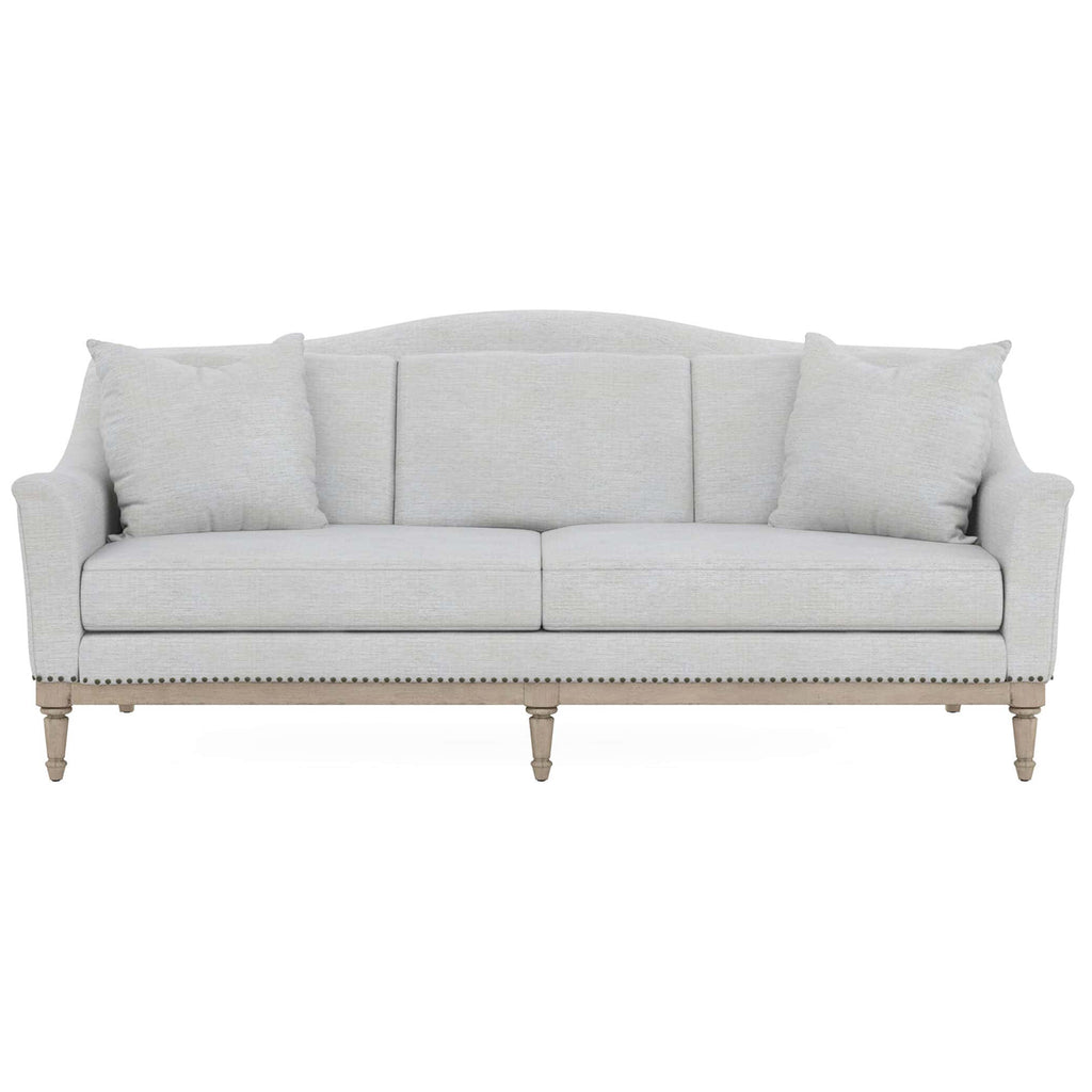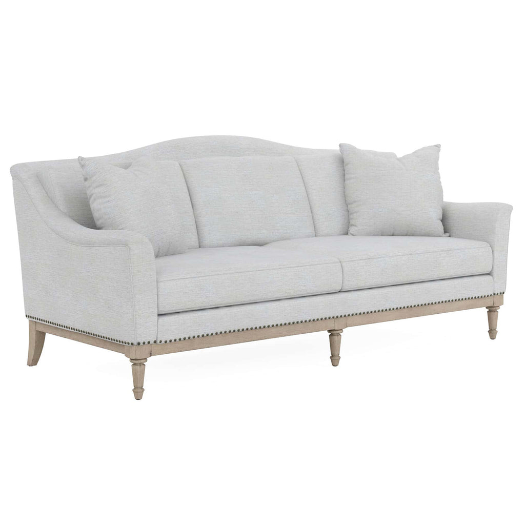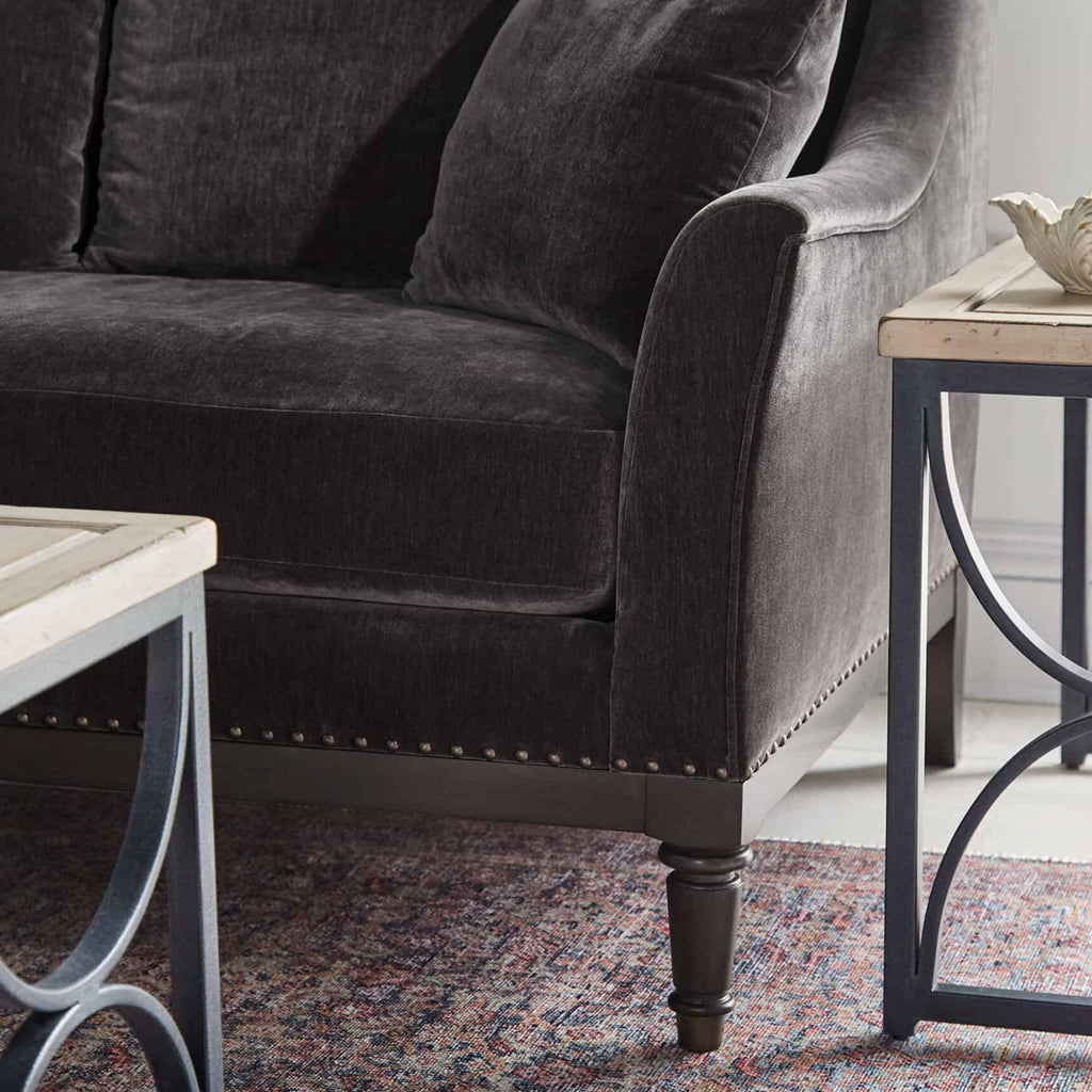 A classic camel back style sofa, A.R.T. Furniture Magritte offers timeless seating at a value. Featuring a 3 over 2 cushion configuration, this generously sized sofa offers a stylish lounging space without sacrificing comfort. Accented with a deep brown wood base, fully turned front gets and antique brass nailhead trim, Magritte has all the makings of an updated traditional aesthetic. Its velvet charcoal upholstery grounds your living space, while two included toss pillows offer extra comfort when desired.