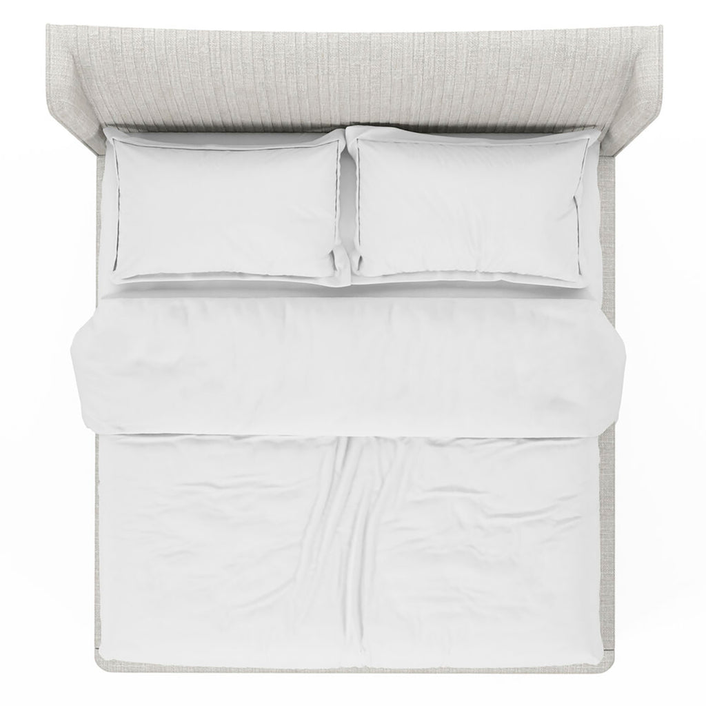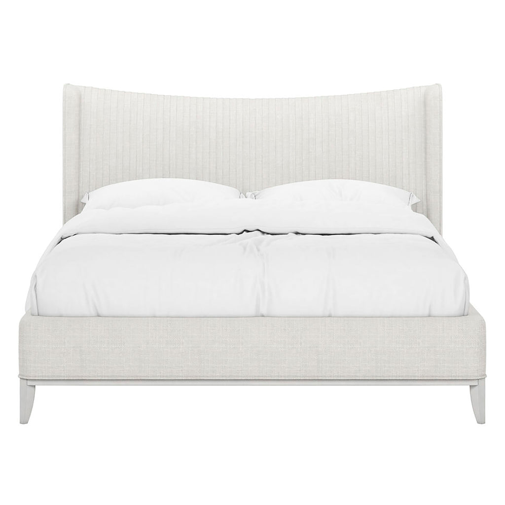 A classic wingback headboard evokes the feeling of an antique piece, presented in a finely tailored ivory upholstery with dove gray legs that suits today?s more streamlined transitional aesthetic. An accent of vertical sewn pleating adds a note of texture to the elegant style of this striking bed. Available in Queen, King and California King sizes.