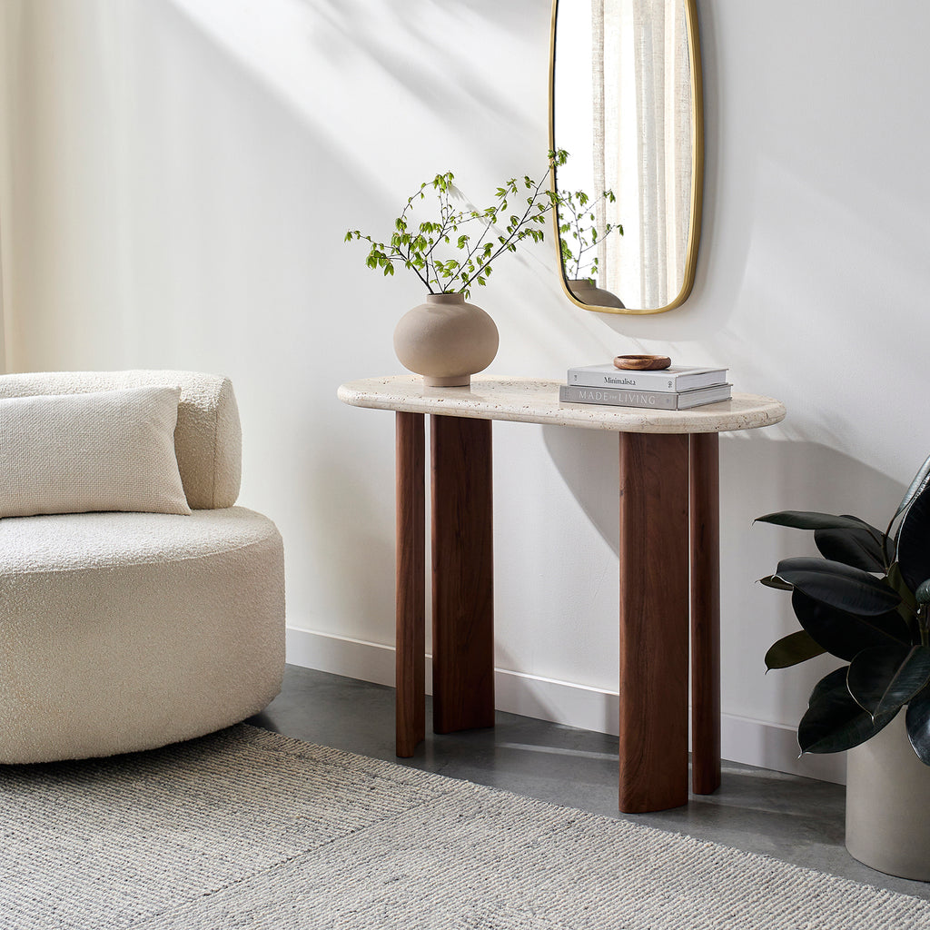 • Material: Travertine Top, Acacia/Manufactured Wood Base
