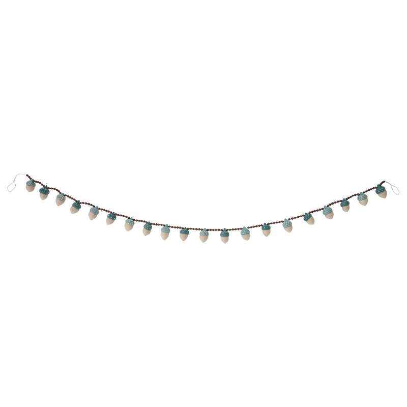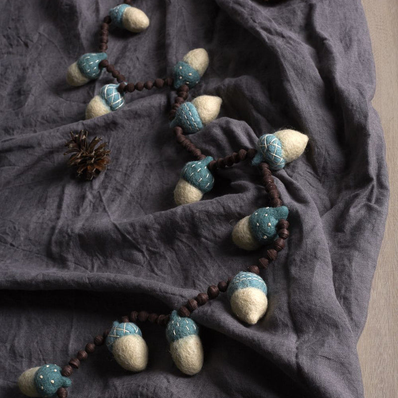 Cozy felt acorns are strung together on a beaded felt strand in the Acorn Garland. These artful acorns are white with a blue embellished cap and can be displayed on a mantle or strung over a harvest table."