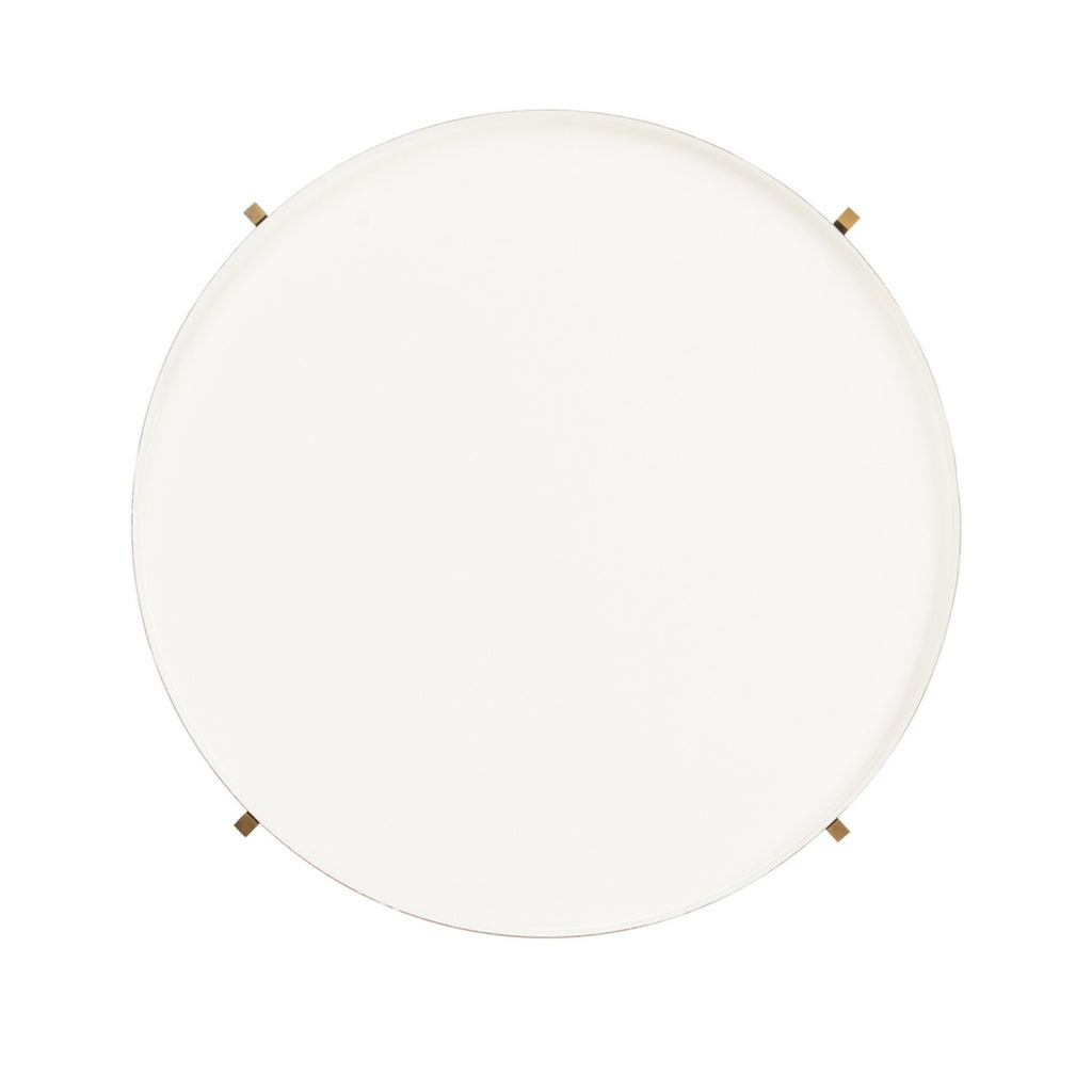Brighten up any space with this contemporary round 5-tier étagère. Poised and polished, its durable iron frame features a chic brass finish that frames its white circular shelves. Designer love to use one on either side of a sofa for instant glamour.