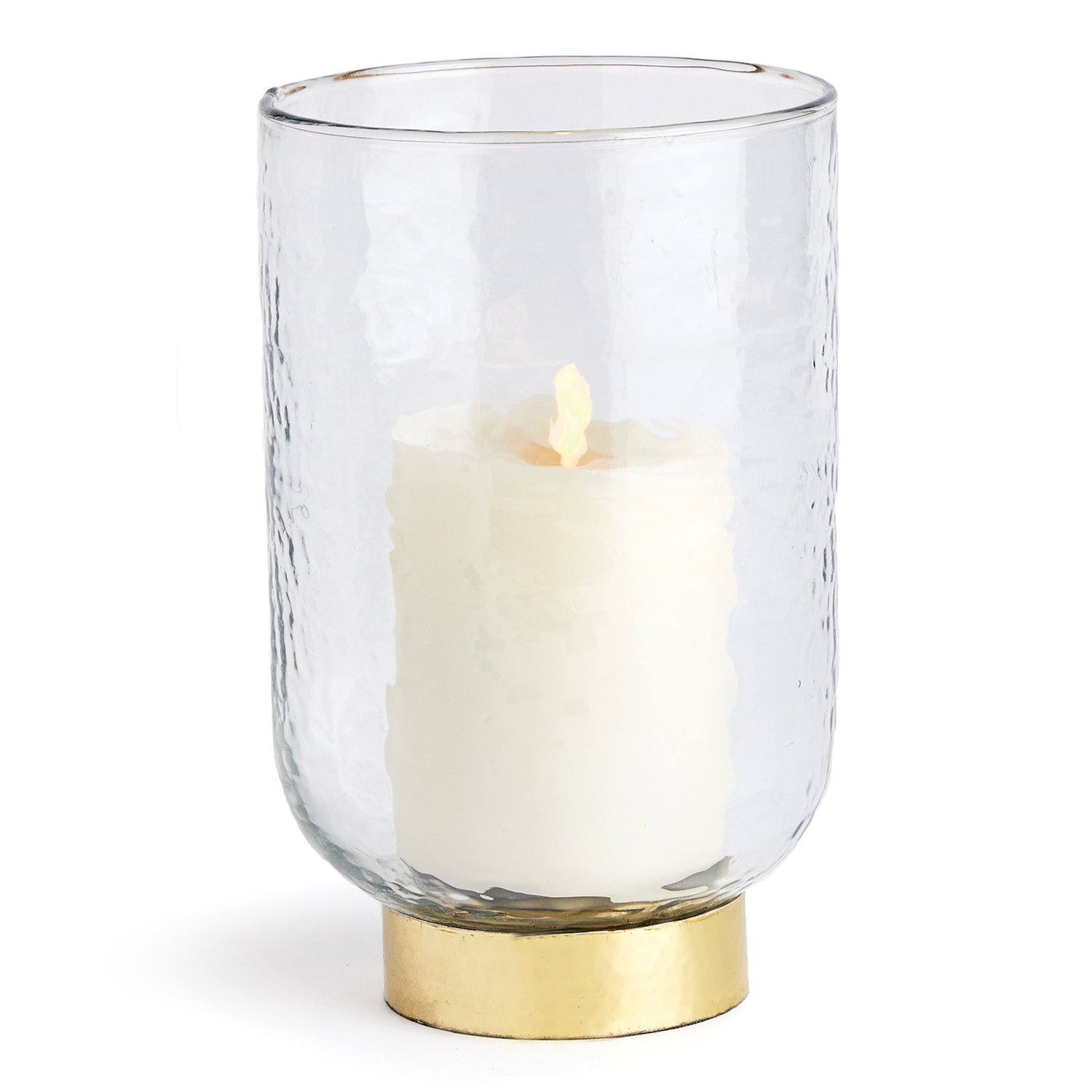 Made of a thick, hammered glass and featuring a melted uneven edge this hurricane has an artisan's touch. Finished off with a hammered gold rim base, an elegant accent for console, bookshelf or mantel.
