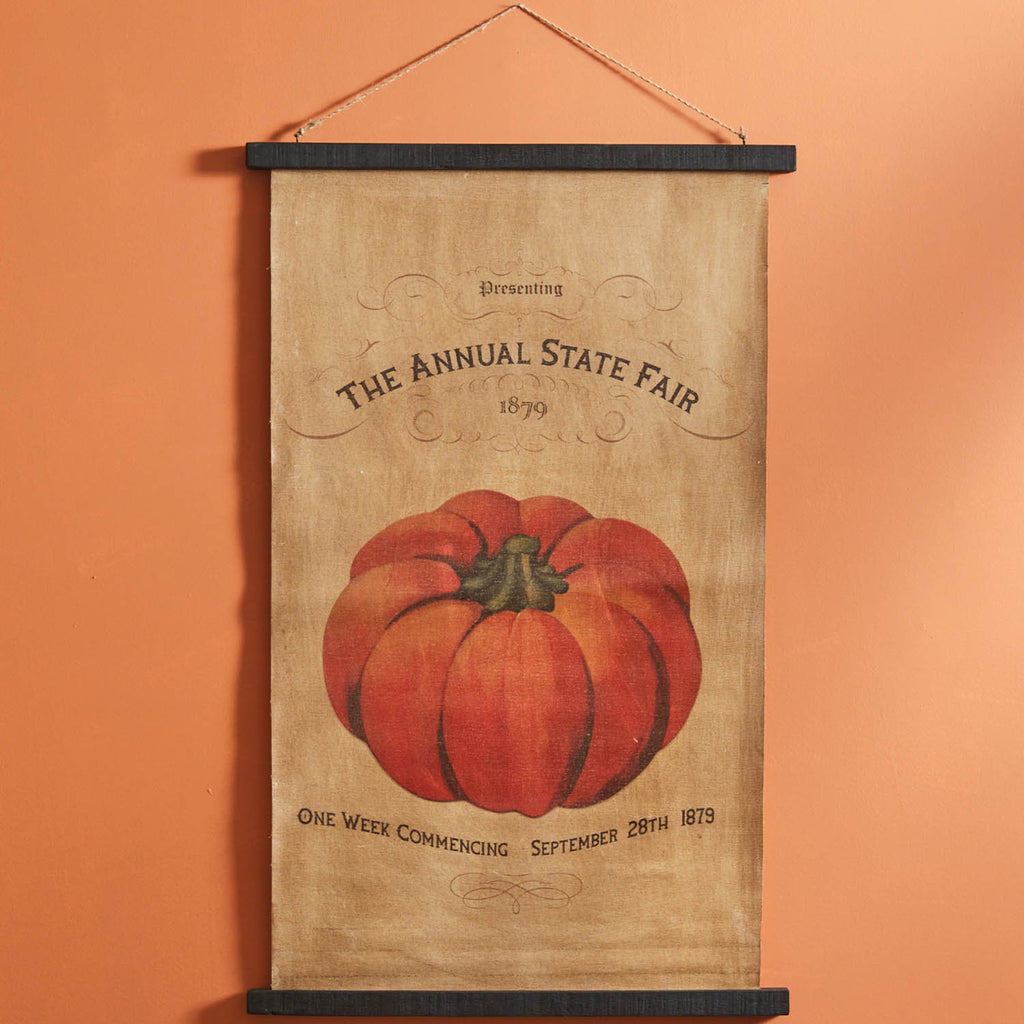 This antiqued canvas wall hanging displays details from the 1879 State Fair. Displayed is a large pumpkin and would be perfect for any fall or country decor. It features a jute rope for hanging and wooden borders on each end.