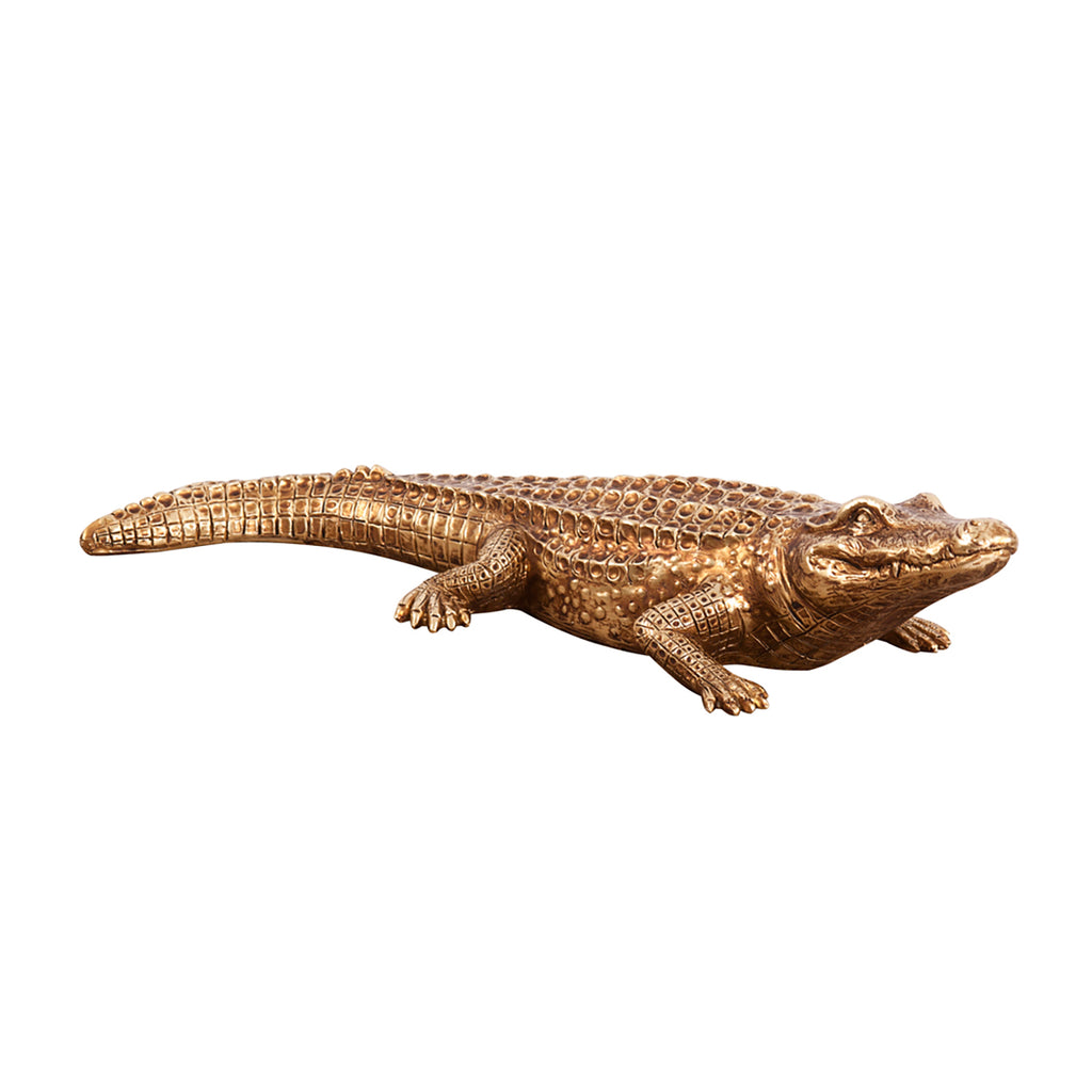 This Crocodile sculpture not only has a toothy grin, it has such detail, that if it weren't for the metallic brassy gold finish, you would swear it was real! A few people have creatively attached this statue to their walls making it appear that they are crawling right up them! From Contemporary, to Art Deco; from Transitional to a Scandinavian look, plus everything in between this piece is sure to fit right into your decor. This statue is a perfect accent piece for console tables, book shelves, entryways or any room in your home.