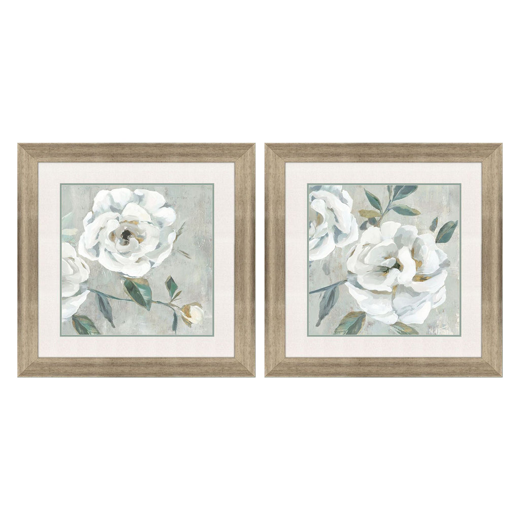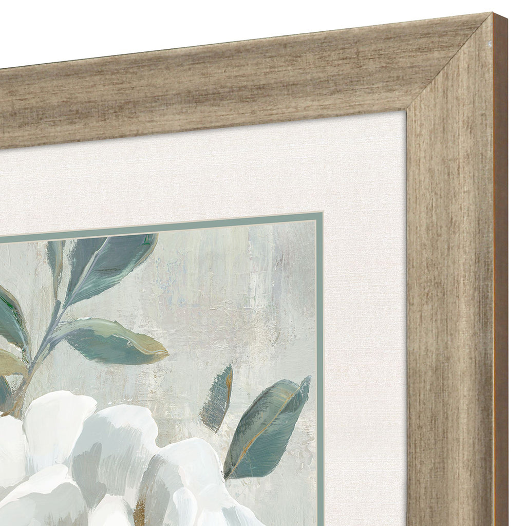 White flower blossoms feature premium matting. Framed in a sloped profile champagne gold finish moulding with a dark wash.