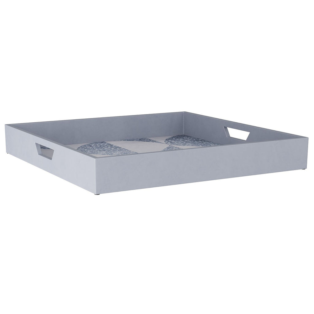 The angles and lines of sacred geometry inform a tray of solid wood. Designed in a two-tone pattern of slate blue mosaic, the interior has the sophisticated pattern found in marble flooring. Finished in solid slate blue about its perimeter, the wood frame has handles at either end.