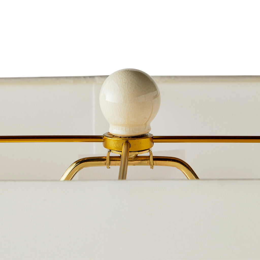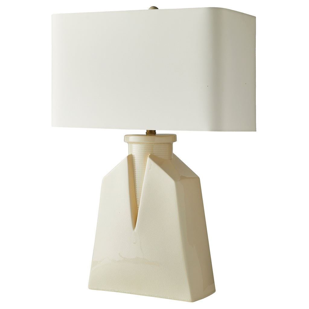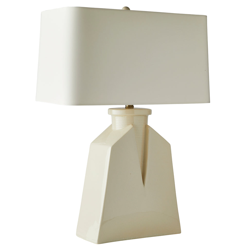 The tailored lines of a split-necked shirt are reflected in the ceramic base of our tapered table lamp. Glazed with an ivory crackle finish, it is topped with an ivory rectangular microfiber shade and matching ceramic finial. Antique brass hardware and clear silver cord. Finish will vary.