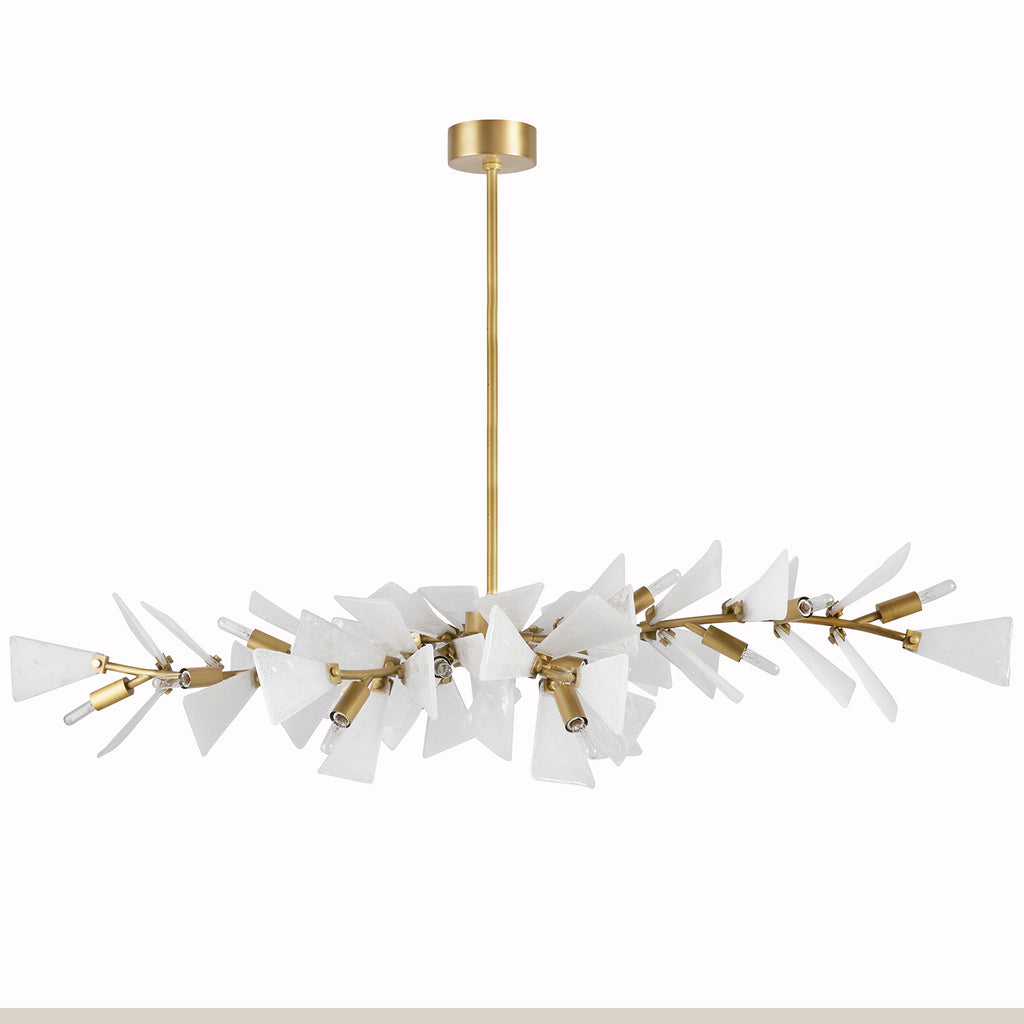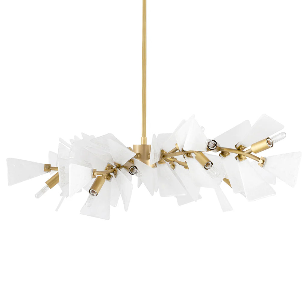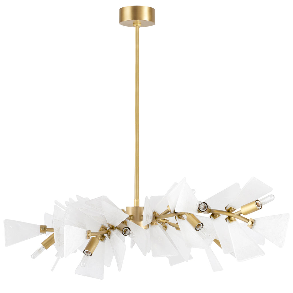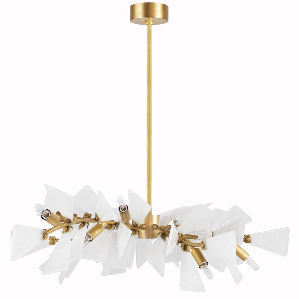 Antique brass-plated steel delivers the drama in one singular, showstopper fixture. Designed with clear, seedy slump glass forms that flow in a wave-like silhouette, the overall effect resembles textured crystals or the shimmering scales of a reptile. A slim antique brass-plated steel pipe and circular plate anchors to the ceiling. Finish will vary.